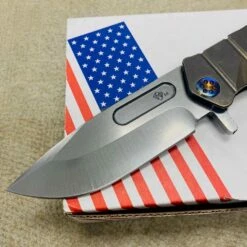 The newest Medford knife is this companion piece to the fixed “Fighter” we call the “USMC Flipper.” This knife has Magnacut tumbled blade, bronze handles, flamed hardware, flamed clip, flamed pommel. This is a unique mix of Titanium components with the very best blade of S35VN heat treated to HRC 58. This a big manly knife that’s as comfortable working, as it is cruising around town in your pocket. There is so much going on with this knife its hard to take in: from the retro milling on the handles, drop-point blade, integral pommel to the bearing pressed into the one-of-a-kind pocket clip. There truly is NOTHING like the USMC Fighter™ Flipper in the knife world. You will want to chop and stab and smash something with this beast in your hand so proceed with caution. Part# MK204SPQ-36A1-TPCP-PP
