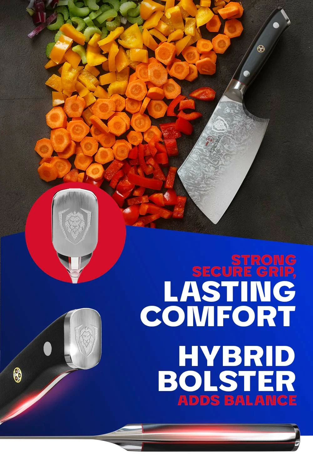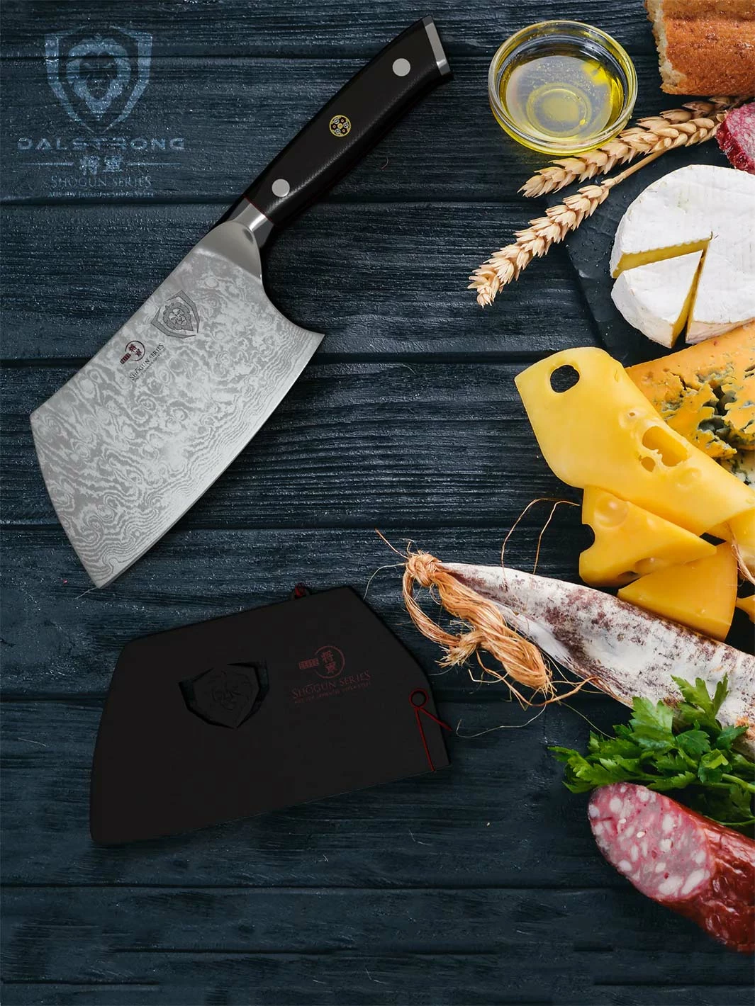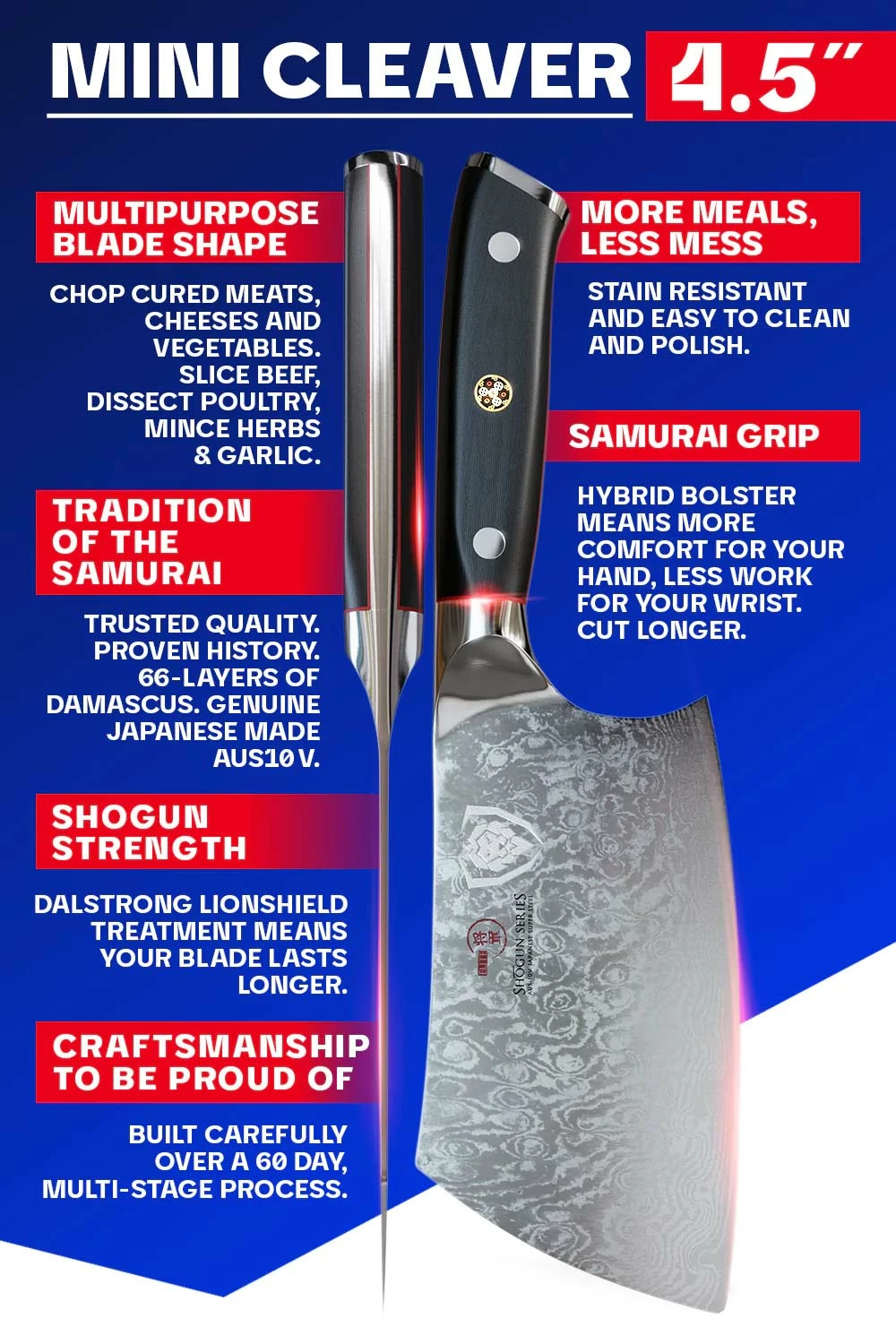 The Shogun Series Elite 4.5” Mini Cleaver offers impressive control and powerful performance, all wrapped up into one stylishly compact package. Engineered from high-quality Japanese AUS-10V super steel, and hand sharpened to an acute 8-10 degrees, the Shogun Series Mini cleaver boasts exceptional edge retention, taking you further, longer. Featuring a moderately sized blade with ample height, this mini-cleaver excels at chopping, mincing and slicing an array of ingredients. As a hybrid between a full-sized cleaver and multi-purpose utility knife, this versatile tool will surprise you with its many uses. From portioning fish, slicing cured meats and cheeses, to dicing fruits and vegetables, don’t underestimate this pint-sized kitchen work-horse. Use the wide-blade to scoop and transfer chopped foods, while the added weight assists the knife in easily dropping through foods. The Shogun Series Mini cleaver is a fun and versatile addition to any chef’s arsenal. Hand-polishing reveals a magnificent visual pattern, Dalstrong Tsunami Rose’. The super-steel core possesses extra high carbon levels, allowing for scalpel-like sharpness with exceptionally long lasting edge retention. Each knife is hand-finished in the Honbazuke 3-step method, creating a beautiful mirror polished edge at a staggeringly acute 8-10 degrees. The Shogun Series handle is meticulously constructed of G-10 Garolite, an incredibly strong military-grade inert and non-porous fiberglass-like material. It is highly impervious to both heat and moisture with life-long durability. The carefully engineered ergonomic handle is designed for superior hand control and comfort. while simultaneously being stabilized with an engraved end-cap for agile performance. To further enhance the beauty, an intricate copper mosaic pin adorns the center rivet. A premium -quality polymer Dalstrong PerfectFit saya (sheath) with embossed Dalstrong logo and pin is included with the set to ensure your blade is carefully protected.