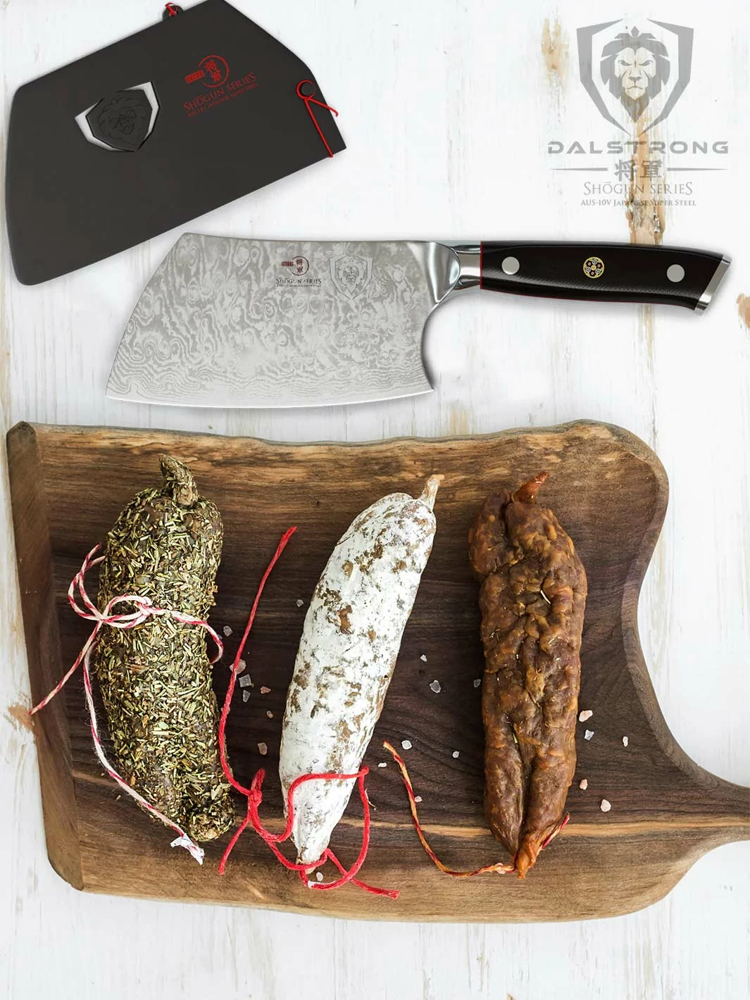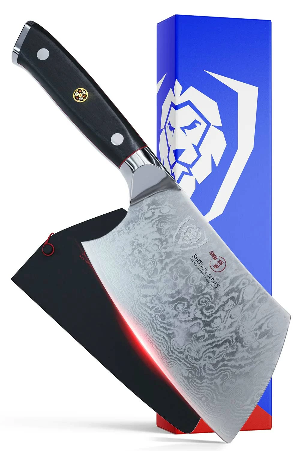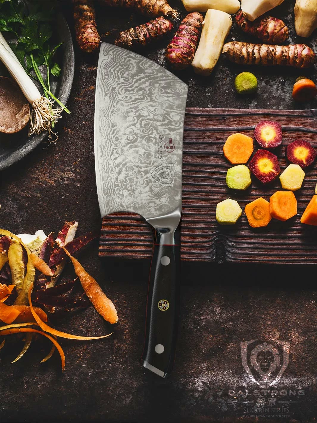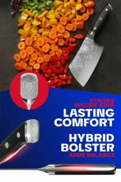 The Shogun Series Elite 4.5” Mini Cleaver offers impressive control and powerful performance, all wrapped up into one stylishly compact package. Engineered from high-quality Japanese AUS-10V super steel, and hand sharpened to an acute 8-10 degrees, the Shogun Series Mini cleaver boasts exceptional edge retention, taking you further, longer. Featuring a moderately sized blade with ample height, this mini-cleaver excels at chopping, mincing and slicing an array of ingredients. As a hybrid between a full-sized cleaver and multi-purpose utility knife, this versatile tool will surprise you with its many uses. From portioning fish, slicing cured meats and cheeses, to dicing fruits and vegetables, don’t underestimate this pint-sized kitchen work-horse. Use the wide-blade to scoop and transfer chopped foods, while the added weight assists the knife in easily dropping through foods. The Shogun Series Mini cleaver is a fun and versatile addition to any chef’s arsenal. Hand-polishing reveals a magnificent visual pattern, Dalstrong Tsunami Rose’. The super-steel core possesses extra high carbon levels, allowing for scalpel-like sharpness with exceptionally long lasting edge retention. Each knife is hand-finished in the Honbazuke 3-step method, creating a beautiful mirror polished edge at a staggeringly acute 8-10 degrees. The Shogun Series handle is meticulously constructed of G-10 Garolite, an incredibly strong military-grade inert and non-porous fiberglass-like material. It is highly impervious to both heat and moisture with life-long durability. The carefully engineered ergonomic handle is designed for superior hand control and comfort. while simultaneously being stabilized with an engraved end-cap for agile performance. To further enhance the beauty, an intricate copper mosaic pin adorns the center rivet. A premium -quality polymer Dalstrong PerfectFit saya (sheath) with embossed Dalstrong logo and pin is included with the set to ensure your blade is carefully protected.