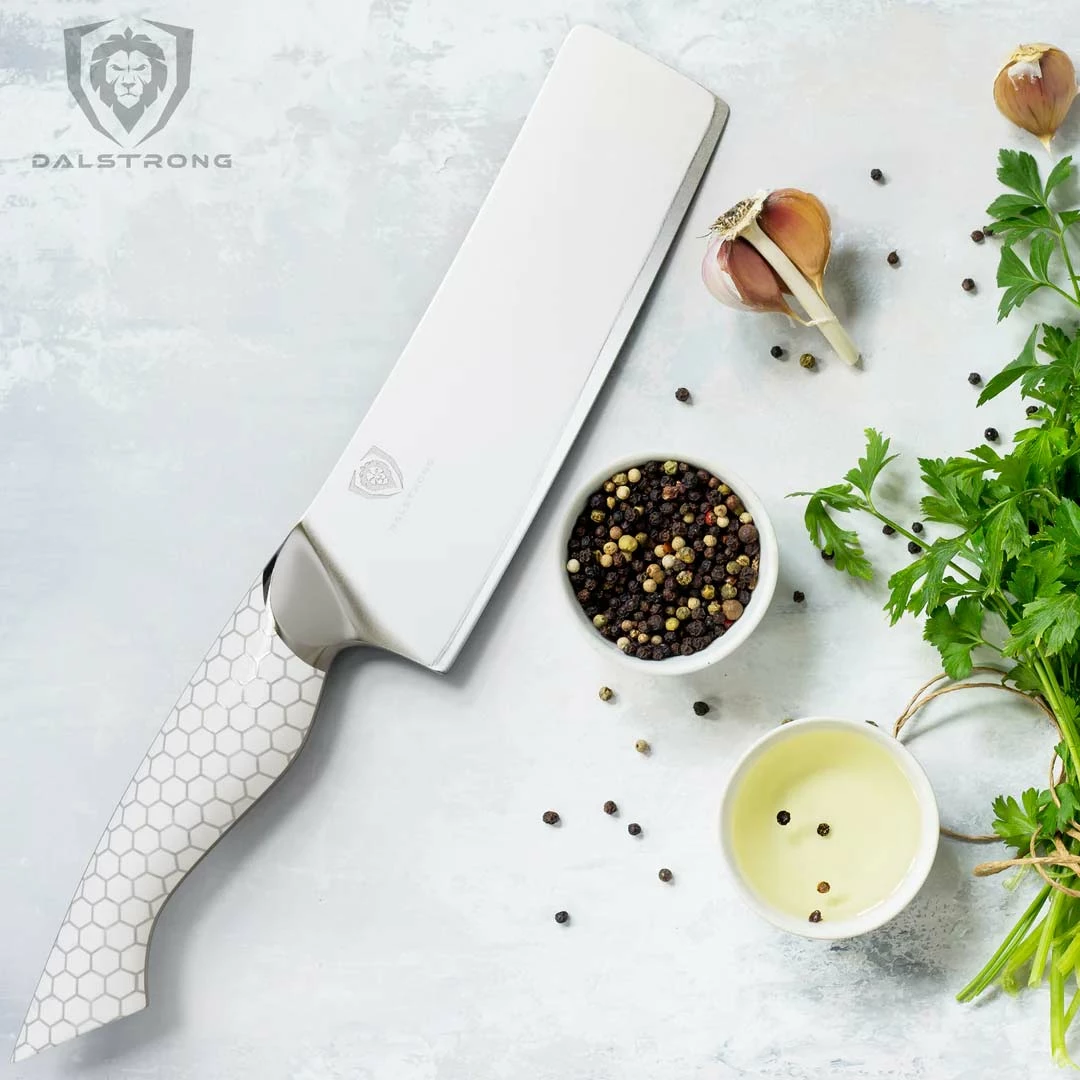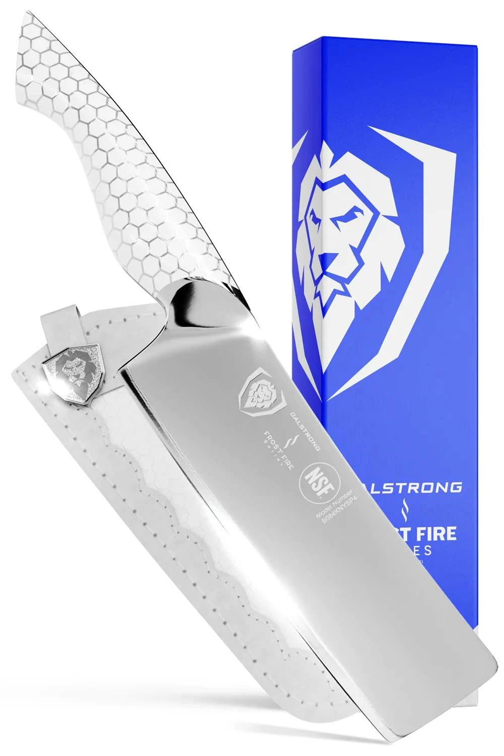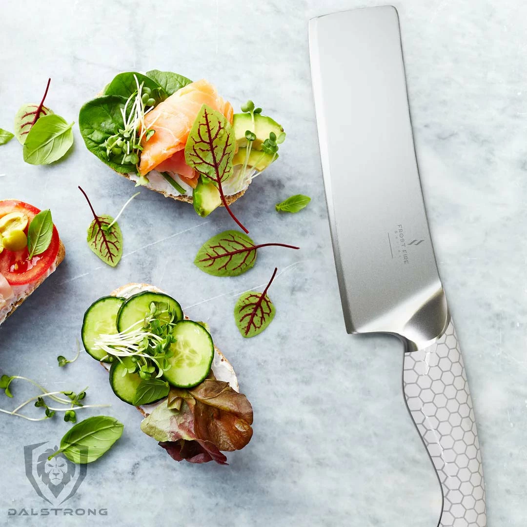 The Frost Fire Series 7” Nakiri Knife makes quick work of preparing vegetables in bulk. This blade combines elements of a chef’s knife with that of a vegetable cleaver. Cleave through tough melons and squash, make quick, clean, push cuts, and transfer foods with ease using this broad, square-tipped blade. The Frost Fire Series – a collection of light-weight, razor-sharp, knives with an icy cold look, and fiery effective performance. Built for the modern chef who appreciates meticulously crafted, professional knives, that look and feel good, without any sacrifices to functionality.