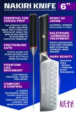 Carefully designed to convey a look of stealthy motion, like a shadow racing through the dark, or a gust of wind blowing through the night, the Phantom Series of knives are elegant, agile and ruthless culinary instruments of exceptional performance. The Nakiri is a favorite among Asian knives for its proficiency, and is essential for any chefs who find themselves prepping vegetables in bulk. Precision forged from a single piece of ice tempered steel, the blade’s straight edge, spine and nose, make it a push-cut specialist, while the wider blades assists in scooping up food for transfer. Improving this blade further are it’s own unique rock-hollow divots, which minimize stuck on food and reduce friction. With a traditional Japanese D-shaped black pakkawood handle designed to tuck perfectly in the palm of your hand. Near the bolster a distinct red spacer and carefully crafted mosaic of copper and brass ensures added elegance and refinement. A hand-polished end cap creates counter balance, ensuring the nimble blade feels more like a ghostly extension of your body, than an ordinary kitchen tool.
