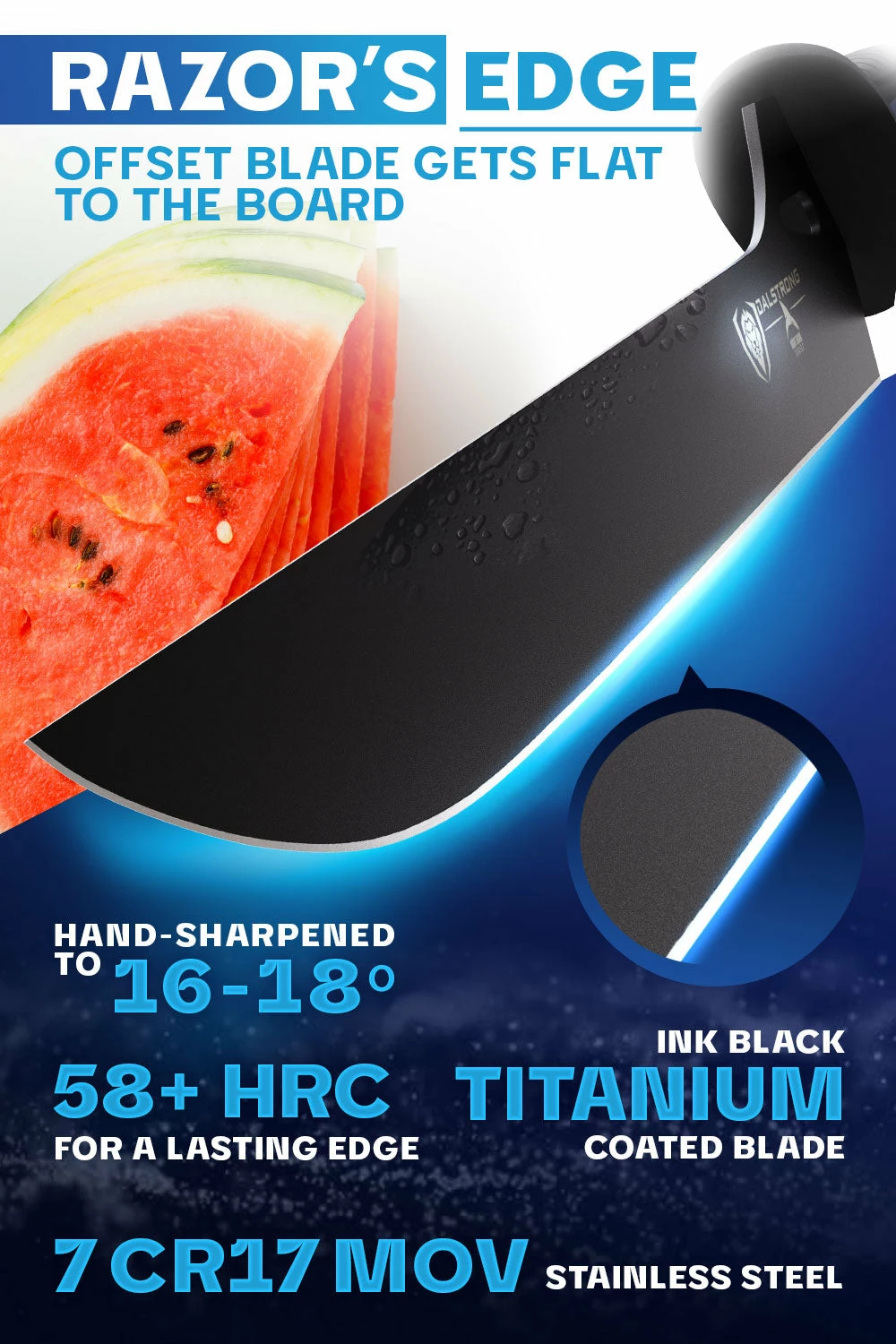The blade is sharp, hard, and built to withstand the salty, acidic kitchen environment. It has a Rockwell Hardness rating of 58+, so it keeps an edge for longer. The ink-black titanium coating gives it stealth and sex appeal, as well as added corrosion resistance. Each Dalstrong blade spends between 30-60 days being painstakingly hand-sharpened by expert craftsmen using Dalstrong’s Diamond Detailing (D3) method.