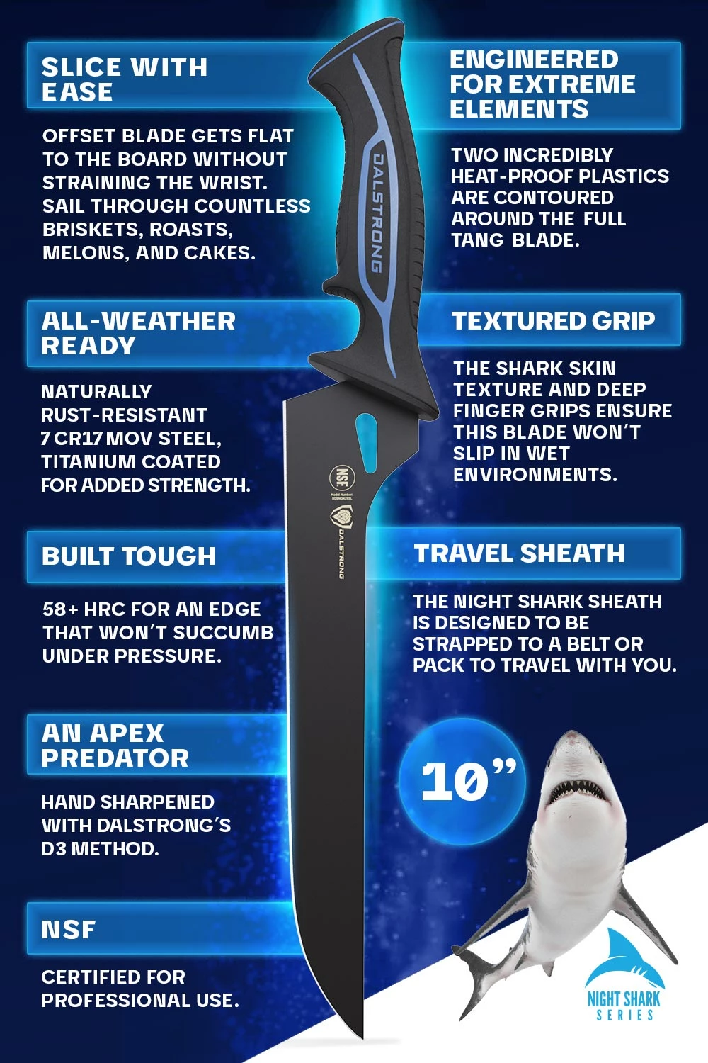 Effortless slicing. The Night Shark 10″ Offset Slicer glides through roasts, briskets, hams, and turkeys and cuts straight to the board, without straining the wrist. Portion melons, sheet cakes, or other large foods with ease.