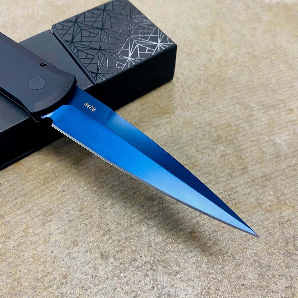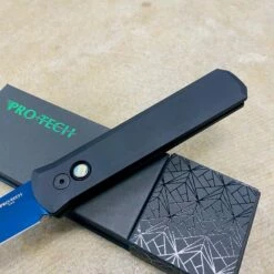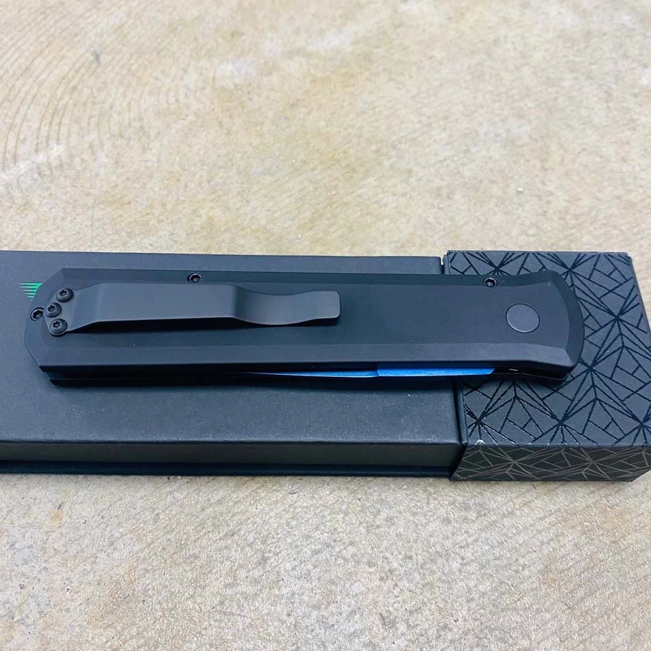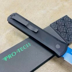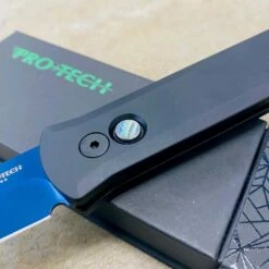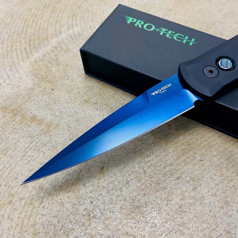 The 4” Blade flagship knife of the Pro-Tech product line! Since it’s introduction in 2001, the Godfather auto knife has been an icon in US produced automatic knives. Solid black handles, sapphire blue blade, black hardware, abalone button, plain edge