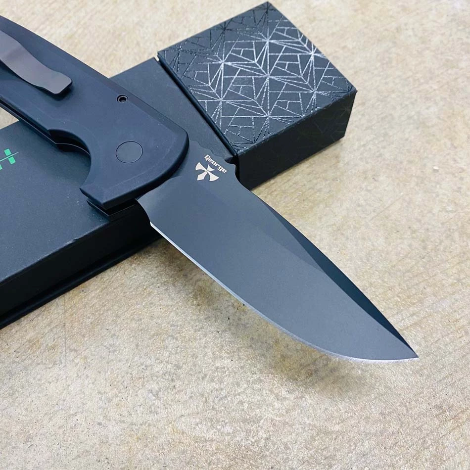 This automatic knife collaboration is an impressive adaptation of the custom Rockeye folder from Les George. This knife has a black handle, black DLC CPM-D2 blade, plain edge, black hardware, black clip, solid black handles