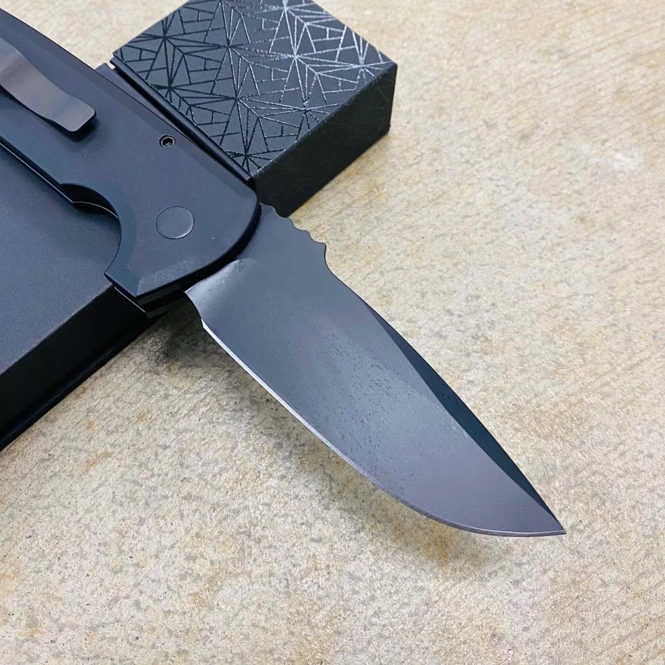 This automatic knife collaboration is an impressive adaptation of the custom Rockeye folder from Les George. This knife has a one side textured black handle, black hardware, tritium push button, black clip, DLC black CPM-D2 blade.