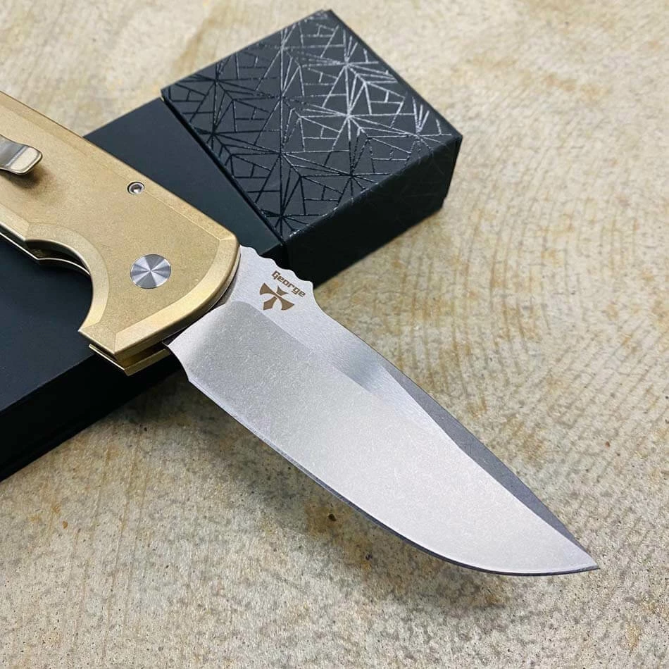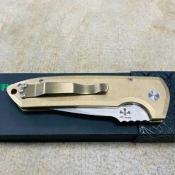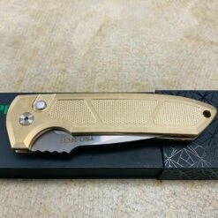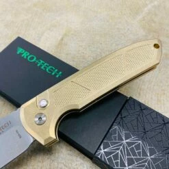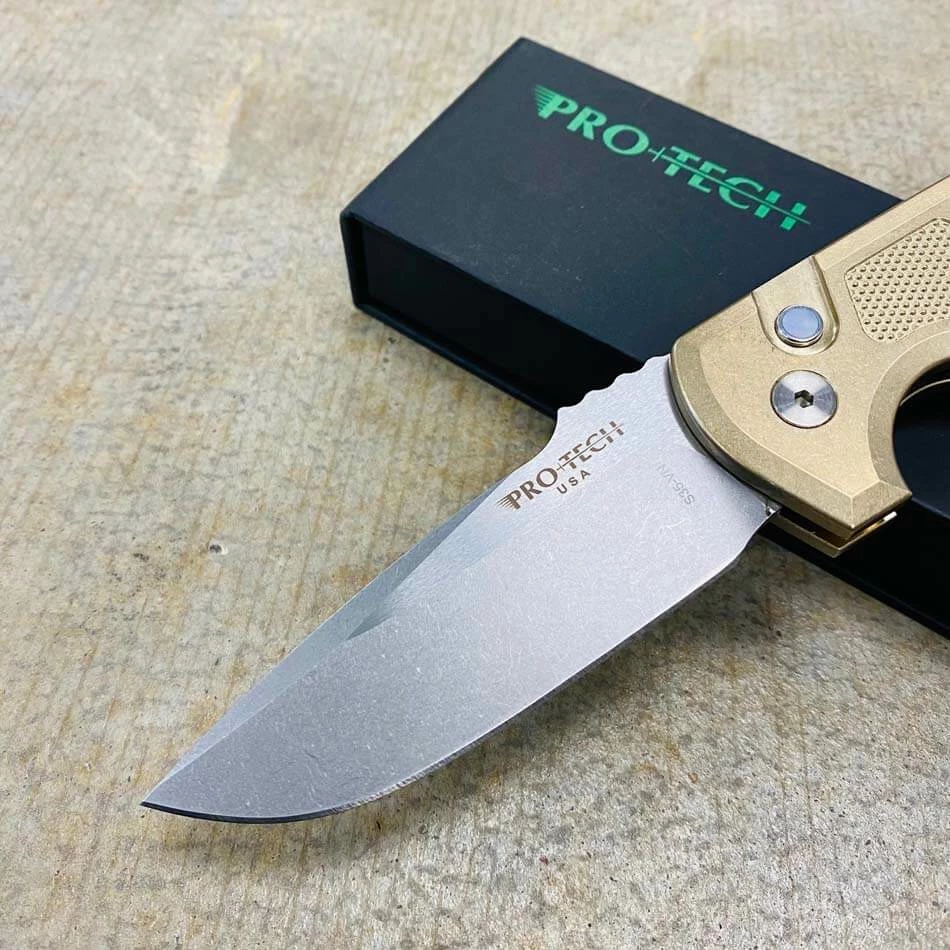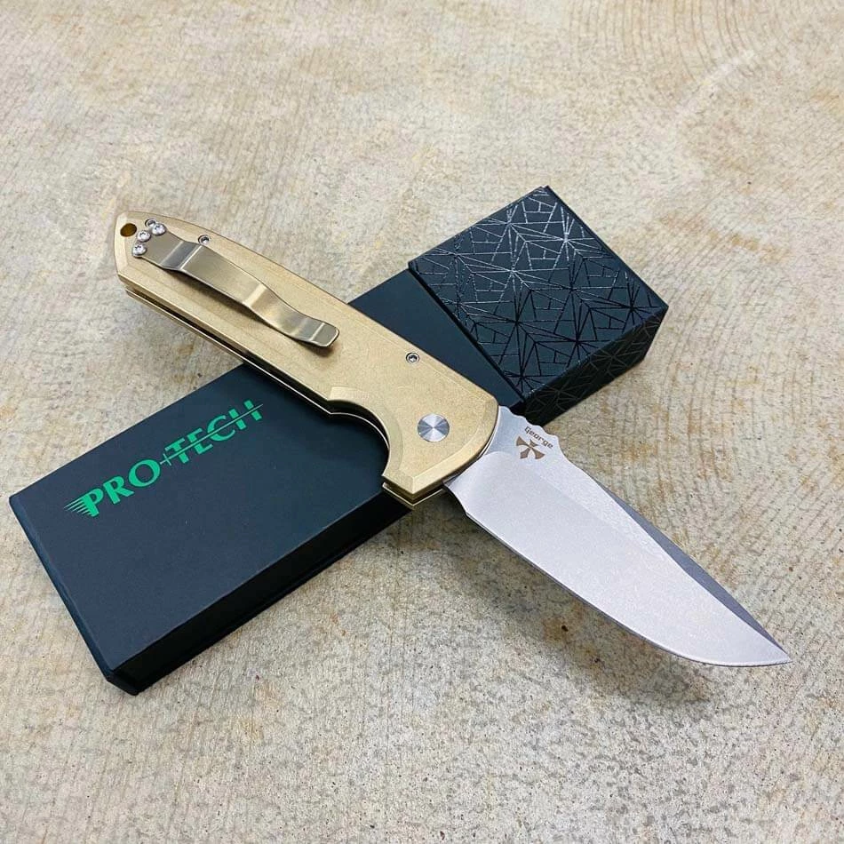 This automatic knife collaboration is an impressive adaptation of the custom Rockeye folder from Les George. Protech LG334 Les George Rockeye 3.4″ CPM-S35VN Stonewash Blade, Textured AL Bronze Handle, MOP Button, Satin Hardware, Titanium Clip Automatic knife
