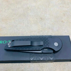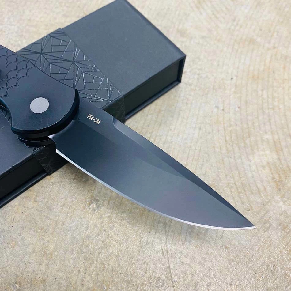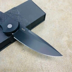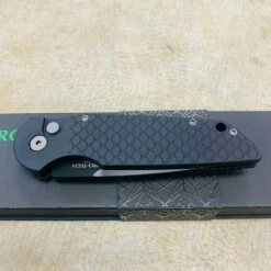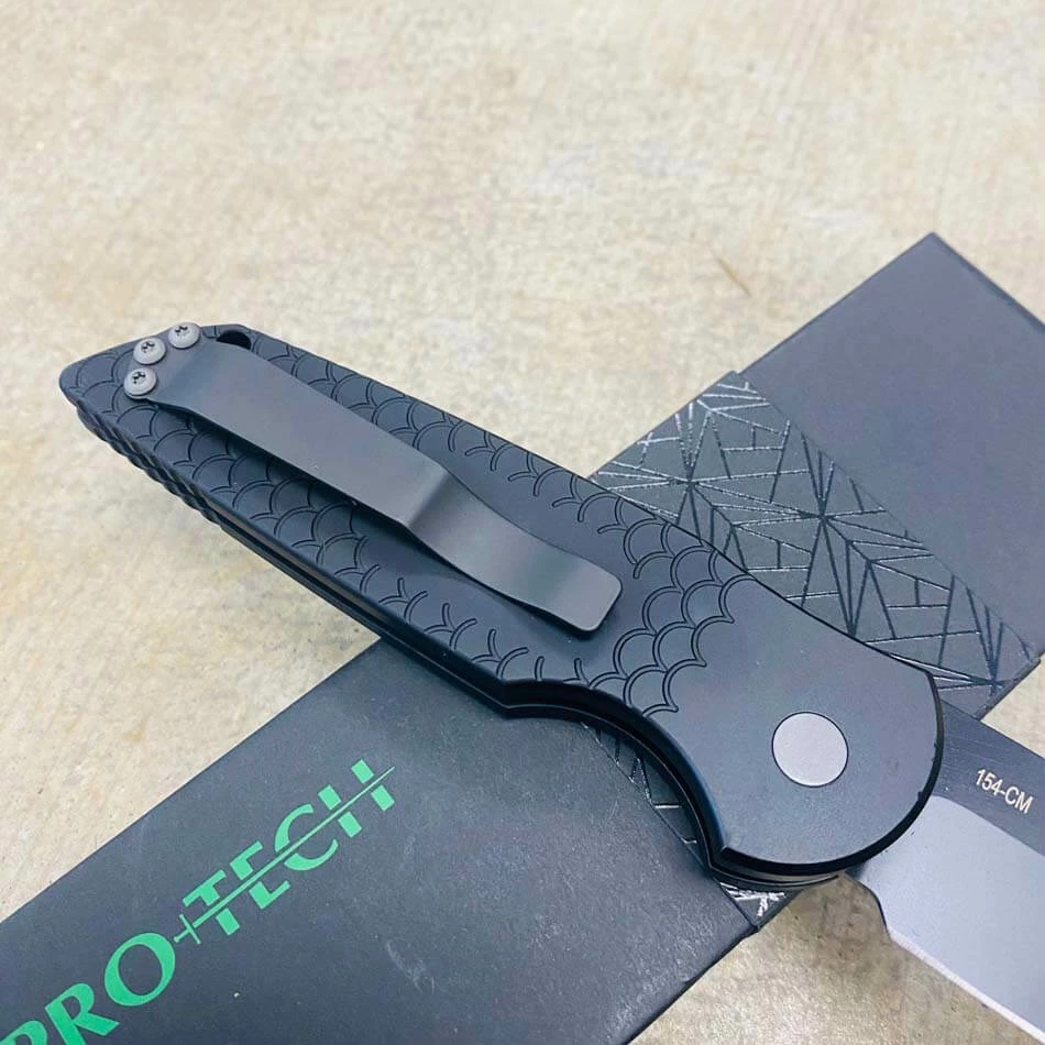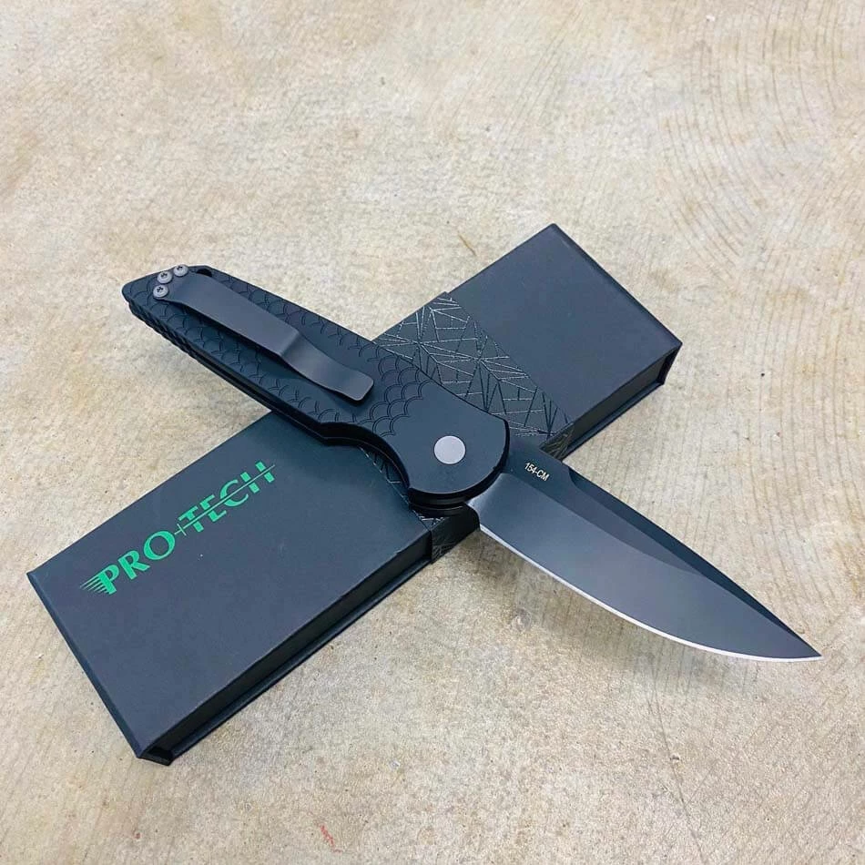 Black handle with “Fish Scale” engraved frame, CPm-D2 black DLC blade, plain edge.