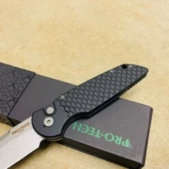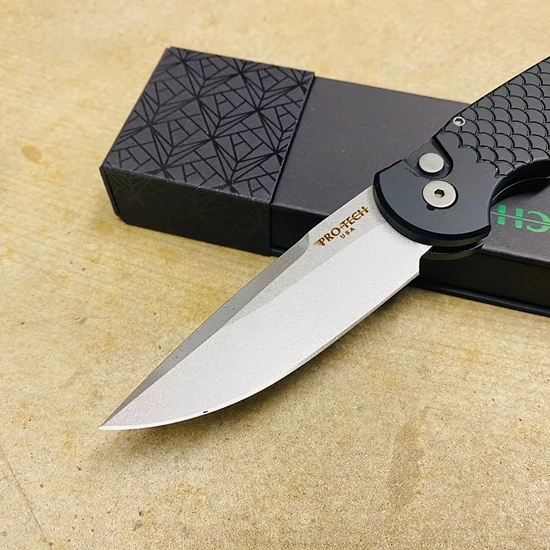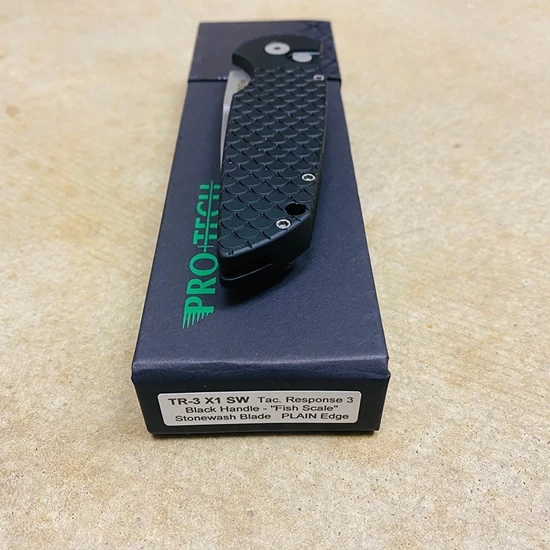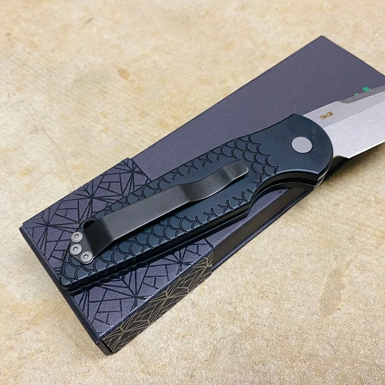 Black handle with “Fish Scale” engraved frame, stonewash blade, plain edge.