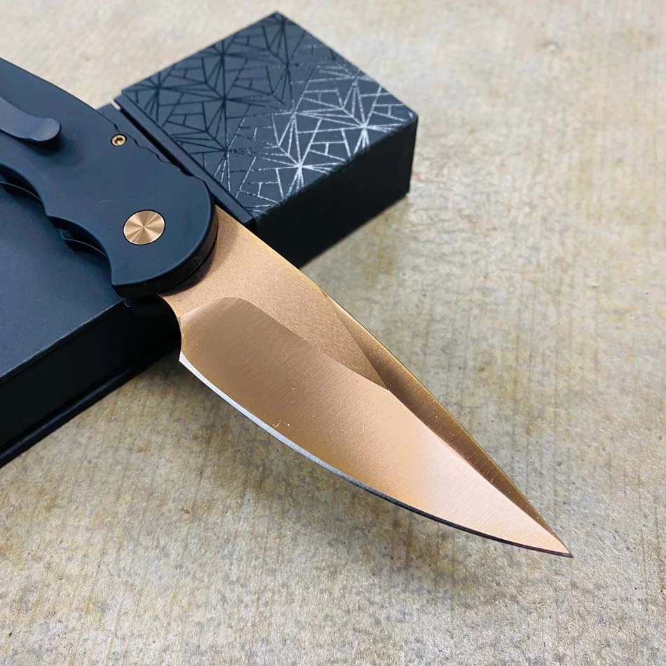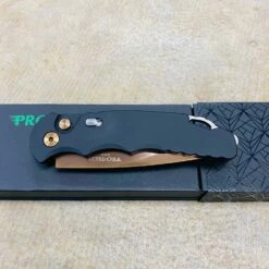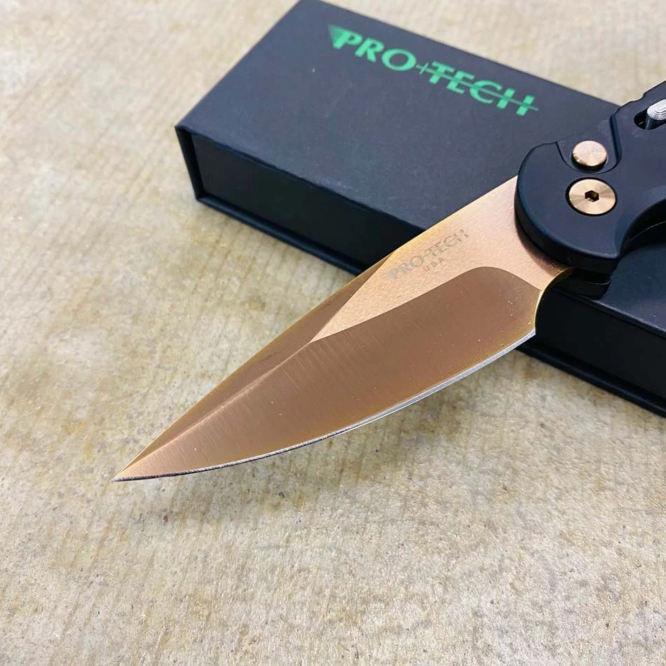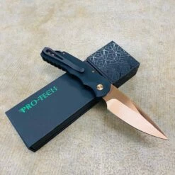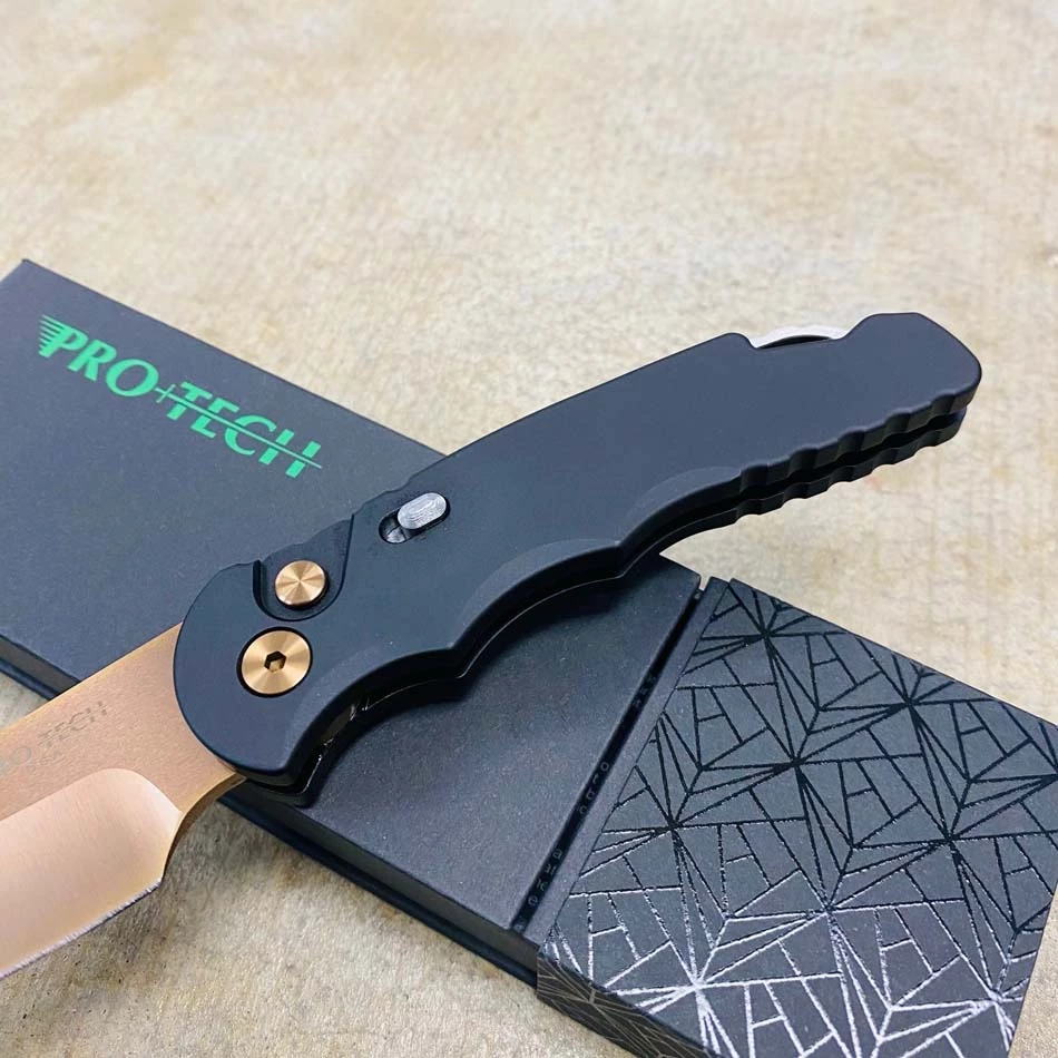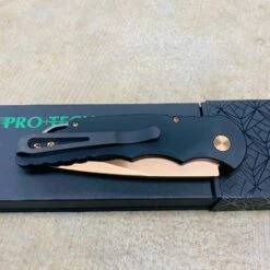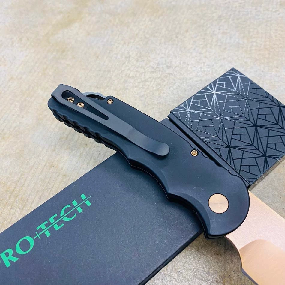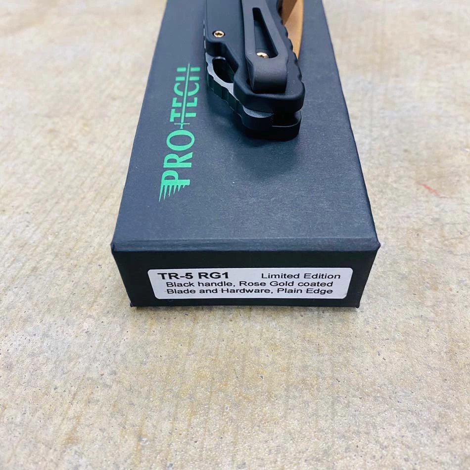 The Pro Tech Auto TR-5 Operator Black features a 3.25″ rose gold satin finished blade with matching rose gold hardware, plain edge, black handle with slide safety and steel glass breaker, deep carry clip.