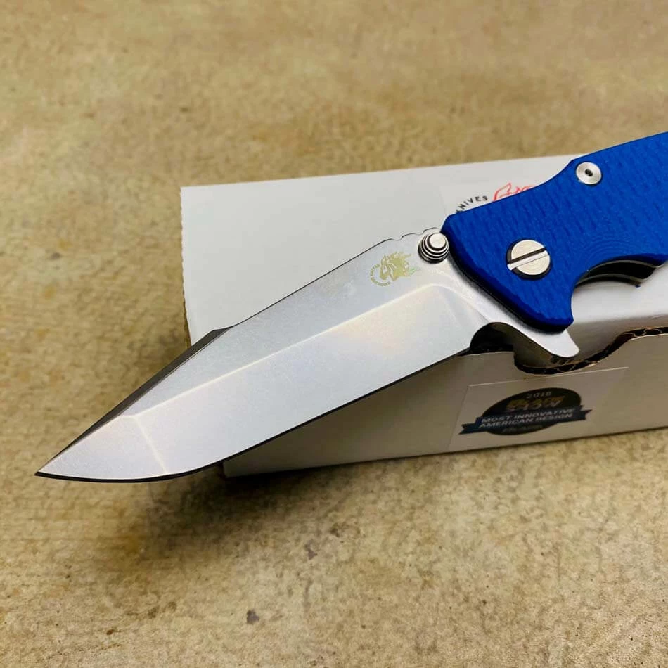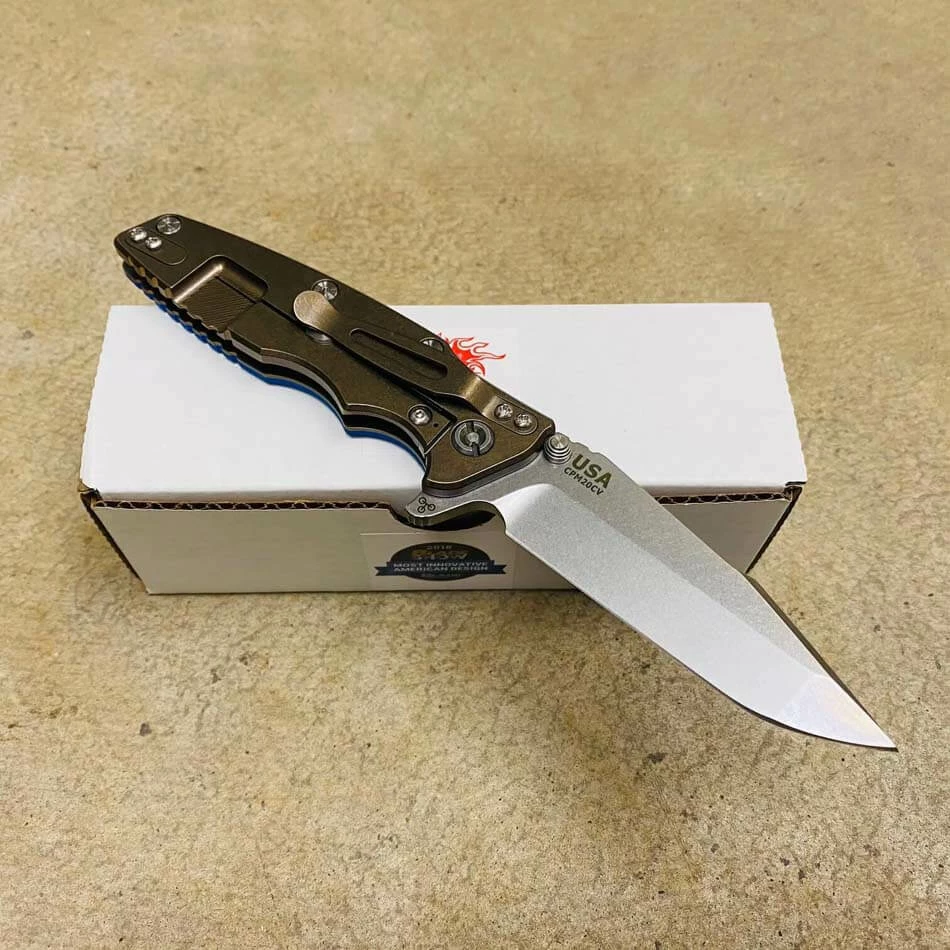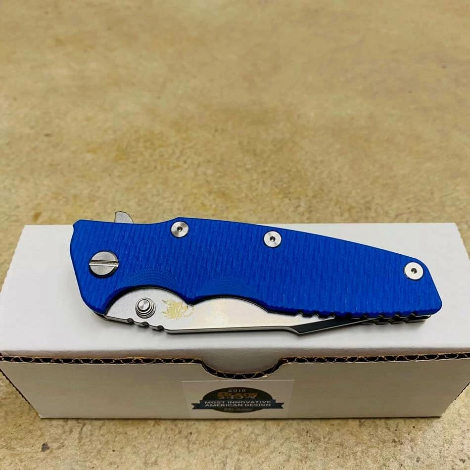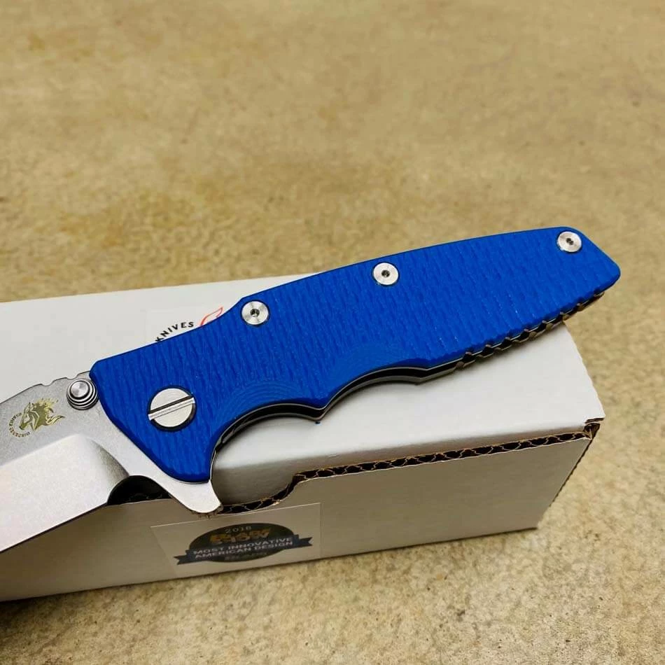Speaking of the pivot, we make our own 17-4PH Stainless steel pivots on a new state of the art CNC turning center thus guarantying precise accuracy. The pivot is a ¼” in barrel diameter with a 3/8″ head. The pivot is drilled and tapped completely through and is mated with an In house designed screw. This system makes for an incredibly strong pivot that is easy to adjust in the field. The Eklise handle shape is designed to be very ergonomic and comfortable in a wide variety of user positions. Not everyone’s hands are the same size, and also grip varies greatly, so the ergonomic handles design is great fit for all users. The textured pattern used on the handle scale is extremely grippy but does not ‘bite’ the hand during use. The 3D texture is designed to flow liquids (such as sweat, oils, blood, etc.) away from your skin and into the valleys of the texture. The lockside is precision CNC manufactured from 6AL4V titanium featuring our Hinderer Lockbar Stabilizer. The knife can be set up for either tip up or tip down carry. The non-lock side has a .050″ titanium liner with a G-10 handle scale. These high strength materials combined with the full titanium liner add strength and rigidity. The handle scales can be easily changed by the end user if another color is desired. The standard finish on all Eklipse folders is a highly durable tumbled/stonewash that will stand up to hard use in all environments. The handle construction is an open back design utilizing huge standoffs. The standoffs are designed to add superior strength for lateral crushing of the handle case while still allowing the blade to nestle into the handle without touching the standoffs. This gives the knife the same strength as a solid back folder while offering the ease of cleaning due to the open design