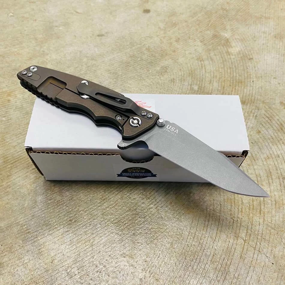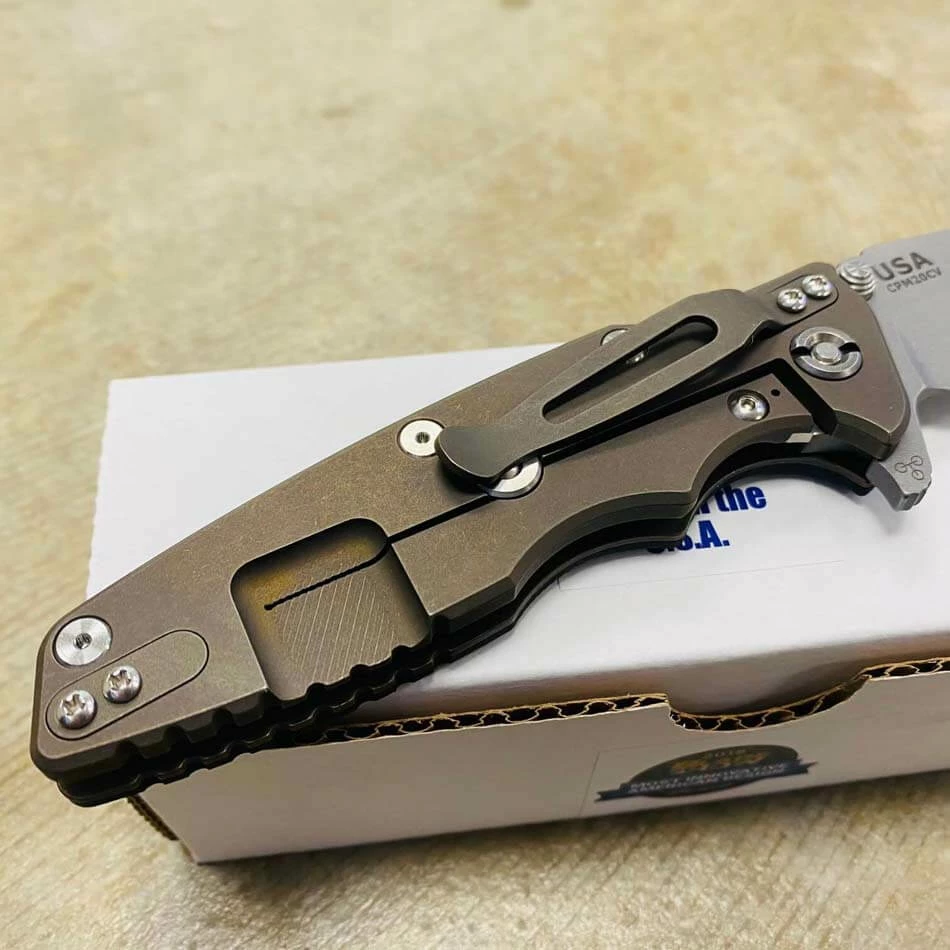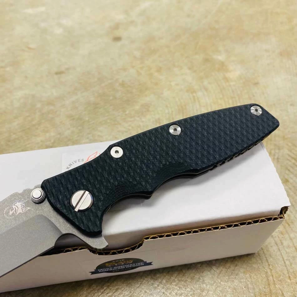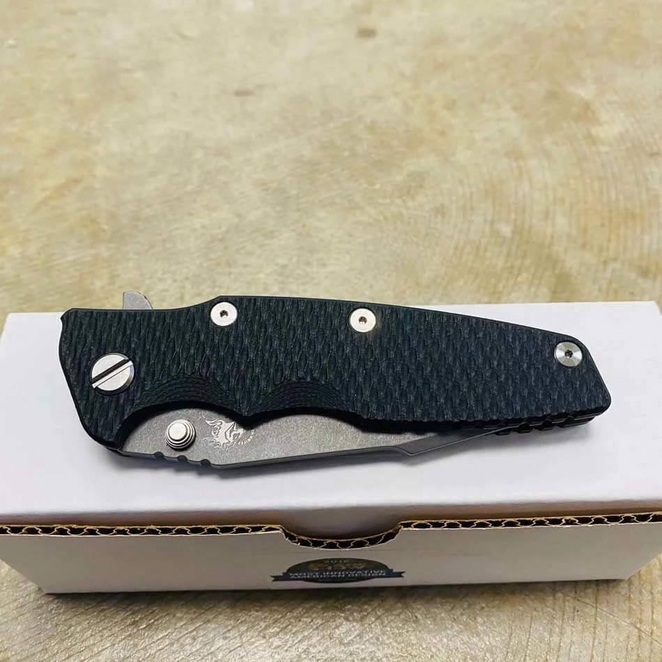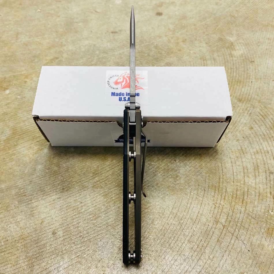 Speaking of the pivot, we make our own 17-4PH Stainless steel pivots on a new state of the art CNC turning center thus guarantying precise accuracy. The pivot is a ¼” in barrel diameter with a 3/8″ head. The pivot is drilled and tapped completely through and is mated with an In house designed screw. This system makes for an incredibly strong pivot that is easy to adjust in the field. The Eklise handle shape is designed to be very ergonomic and comfortable in a wide variety of user positions. Not everyone’s hands are the same size, and also grip varies greatly, so the ergonomic handles design is great fit for all users. The textured pattern used on the handle scale is extremely grippy but does not ‘bite’ the hand during use. The 3D texture is designed to flow liquids (such as sweat, oils, blood, etc.) away from your skin and into the valleys of the texture. The lockside is precision CNC manufactured from 6AL4V titanium featuring our Hinderer Lockbar Stabilizer. The knife can be set up for either tip up or tip down carry. The non-lock side has a .050″ titanium liner with a G-10 handle scale. These high strength materials combined with the full titanium liner add strength and rigidity. The handle scales can be easily changed by the end user if another color is desired. The standard finish on all Eklipse folders is a highly durable tumbled/stonewash that will stand up to hard use in all environments. The handle construction is an open back design utilizing huge standoffs. The standoffs are designed to add superior strength for lateral crushing of the handle case while still allowing the blade to nestle into the handle without touching the standoffs. This gives the knife the same strength as a solid back folder while offering the ease of cleaning due to the open design