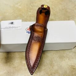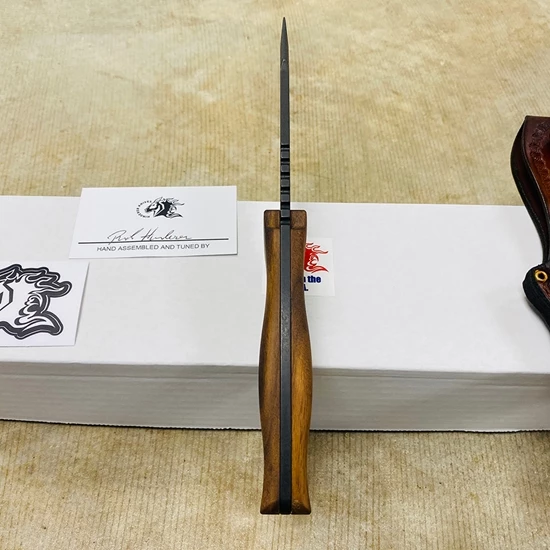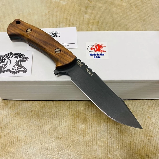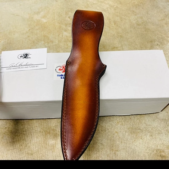 Fresh on the heels of the success of the Ranch series Bowie comes the new Ranch Harpoon Spanto-Vintage Series. All of the features that you liked with the Bowie, is the same with the Harpoon Spanto with the exception of the new Harpoon Spanto blade style. This blade style started with the XM-18 as a multipurpose heavy-duty workhorse and its no different with the Ranch series. The Spanto style grind is very versatile in that it allows for a “slicing” style of blade but with a heavier “armored” tip. The “harpoon” style of top line gives it that bad ass type of look while giving a bit more meat to the blade. This first edition is made in the popular Vintage style. The blade is made of 0-1 tool steel and then parkarized just like old vintage firearms and knives of WW2. The handle is made of natural walnut contoured for a comfortable sure grip and then finished in a boiled linseed finish 3 times to give it a long lasting durable finish. The sheath is a heavy duty leather sheath handmade by local Amish craftsmen. It uses heavy stitching with reinforcing grommets at the throat.