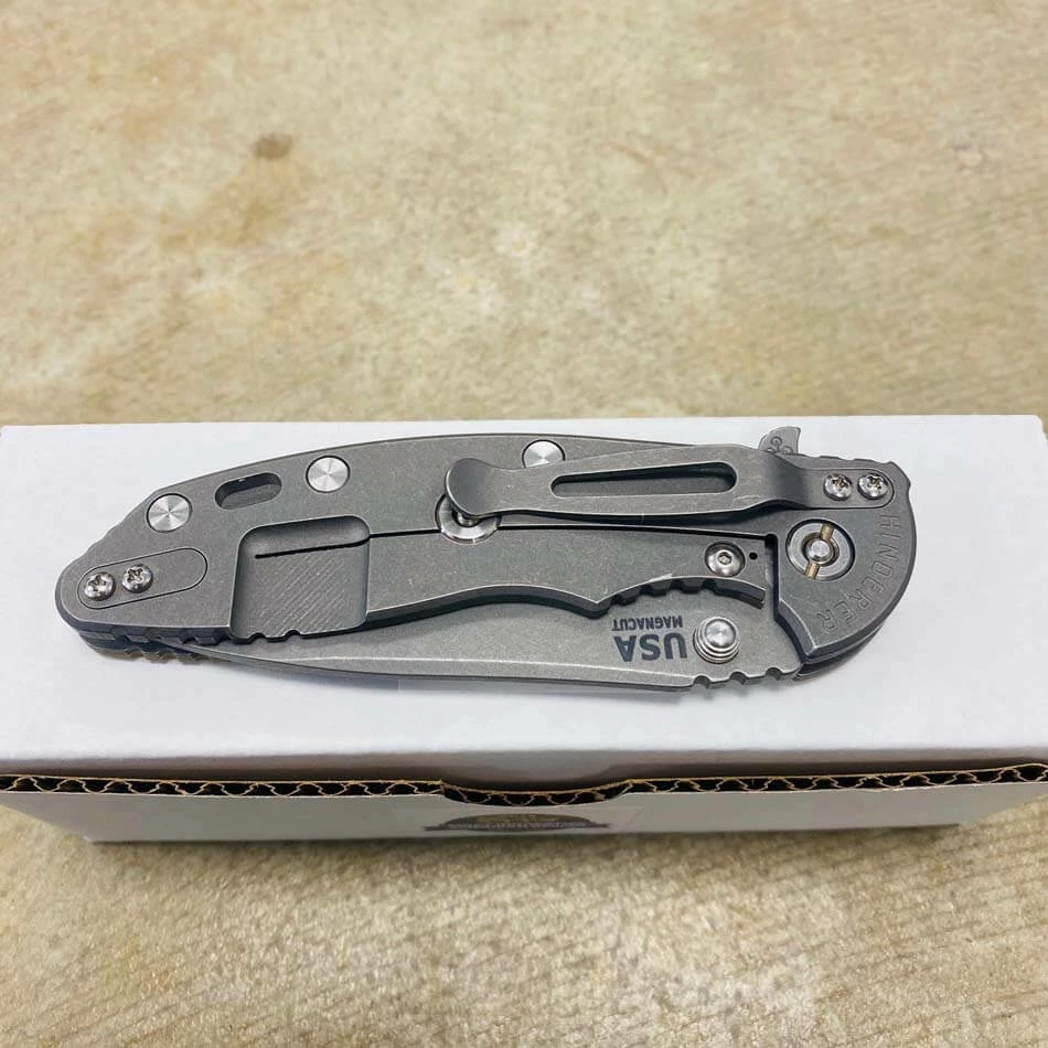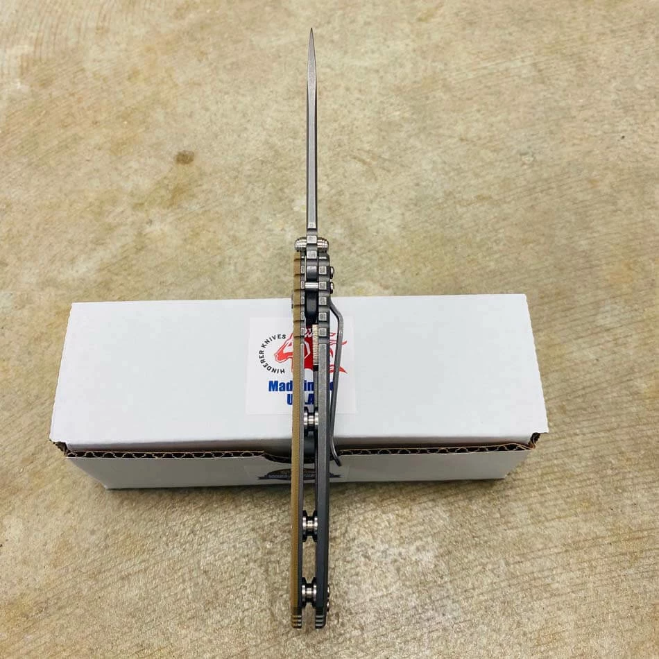For Hinderer’s first “Slicer Grind” style of blade grind he chose his spearpoint style of blade. As shown in the accompanying graphic this grind runs shallow at the back part or the handle end of the blade and as it traverses toward the front of the blade the grind slants upwards towards the top of the blade and extends to its widest part at the front portion.
