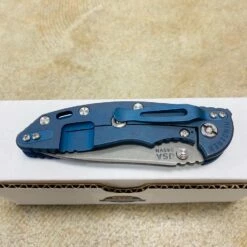 The XM Series CNC flat ground Spanto blade is the best of both worlds offering maximum cutting potential in a blade that has a durable tip for prying. The oversized choil permits choking up on the blade for more precise work. The blade locks up on a solid ¼ in diameter Thumb stud which is press fitted into the blade. This makes for a very strong lockup as there is no loosening of the thumb stud which can happen with two piece designs. The fact that the thumb stud locks up against the frame adds an incredible amount of strength to the sideways torque of the blade as the sideways stresses are being stopped by the whole handle side, thus relieving the stress that would normally be put on the pivot.