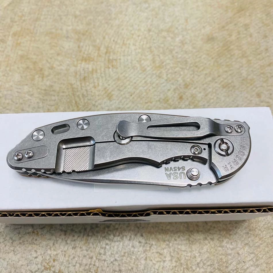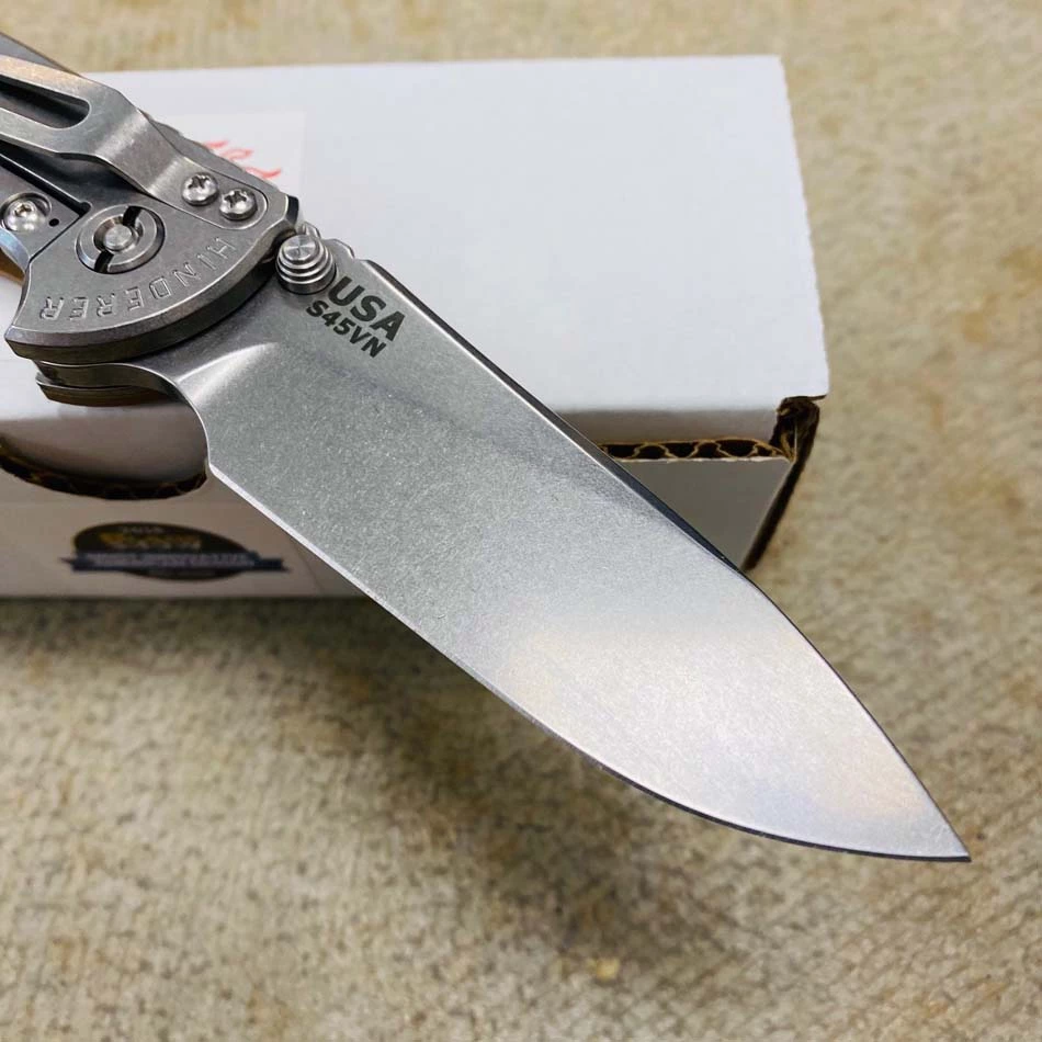 The XM Series CNC flat ground Spanto blade is the best of both worlds offering maximum cutting potential in a blade that has a durable tip for prying. The oversized choil permits choking up on the blade for more precise work. The blade locks up on a solid ¼ in diameter Thumb stud which is press fitted into the blade. This makes for a very strong lockup as there is no loosening of the thumb stud which can happen with two piece designs. The fact that the thumb stud locks up against the frame adds an incredible amount of strength to the sideways torque of the blade as the sideways stresses are being stopped by the whole handle side, thus relieving the stress that would normally be put on the pivot.