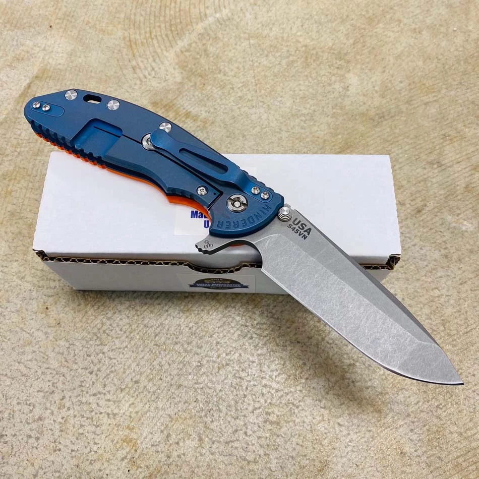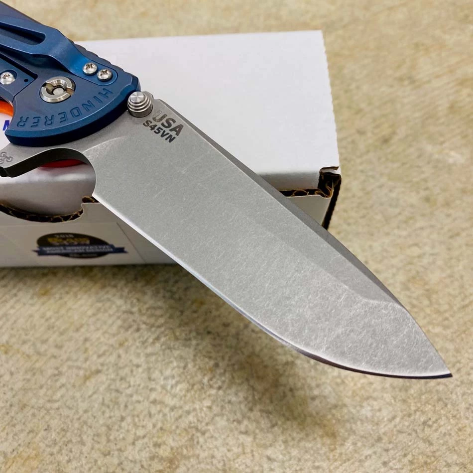 The XM Series CNC flat ground Spanto blade is the best of both worlds offering maximum cutting potential in a blade that has a durable tip for prying; the blade thickness on a 4.0″ XM-24 is a full .165″ retaining its thickness right out to the tip. The oversized choil permits choking up on the blade for more precise work. The blade locks up on a solid 1/4 in diameter Thumb stud which is press fitted into the blade. This makes for a very strong lockup as there is no loosening of the thumb stud which can happen with two piece designs. The fact that the thumb stud locks up against the frame adds an incredible amount of strength to the sideways torque of the blade as the sideways stresses are being stopped by the whole handle side, thus relieving the stress that would normally be put on the pivot.