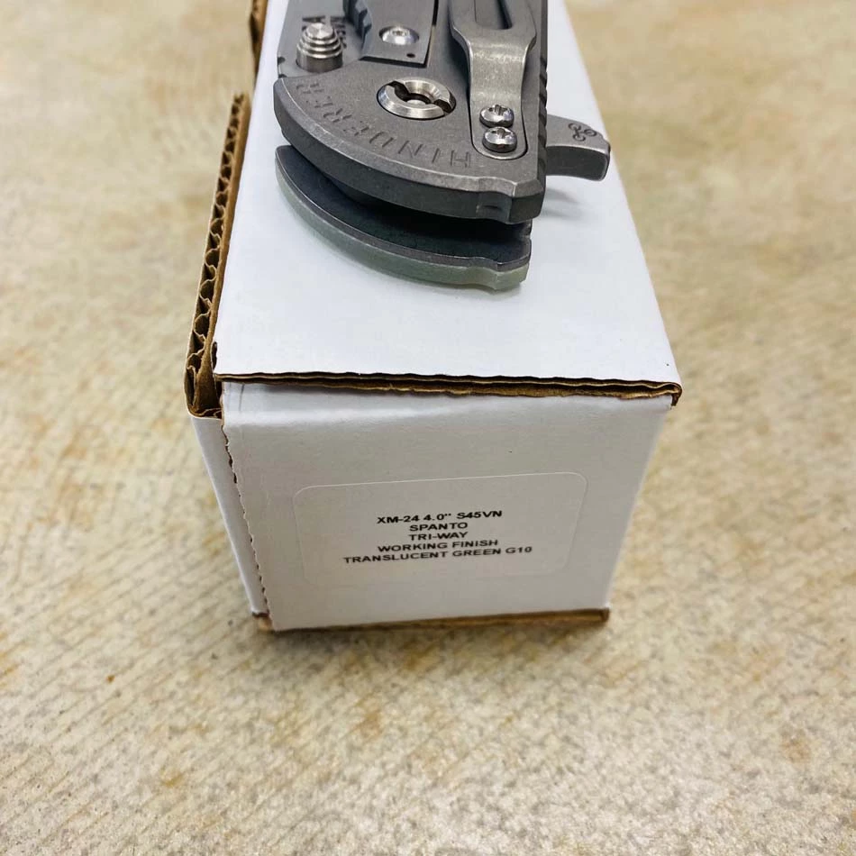 The XM Series CNC flat ground Spanto blade is the best of both worlds offering maximum cutting potential in a blade that has a durable tip for prying; the blade thickness on a 4.0″ XM-24 is a full .165″ retaining its thickness right out to the tip. The oversized choil permits choking up on the blade for more precise work. The blade locks up on a solid 1/4 in diameter Thumb stud which is press fitted into the blade. This makes for a very strong lockup as there is no loosening of the thumb stud which can happen with two piece designs. The fact that the thumb stud locks up against the frame adds an incredible amount of strength to the sideways torque of the blade as the sideways stresses are being stopped by the whole handle side, thus relieving the stress that would normally be put on the pivot.