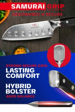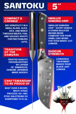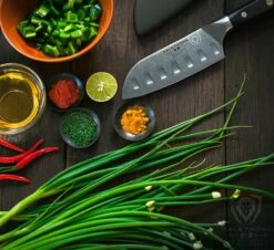 The Ultra-Versatile Mini-Santoku Knife: This compact 5” santoku is a master of precision work and medium-sized cutting tasks, featuring a shorter blade and smaller handle than its larger 7” counterpart. Outstanding craftsmanship, cutting-edge technology, inspired design, and the best materials available. Peak performance never looked so good at this price. An ultra sharp AUS-10V (with a specialized vacuum heat-treatment which upgrades performance) Japanese super steel cutting core at 62+ Rockwell ensures extraordinary performance and edge retention. The interior steel is sandwiched between 66 layers of premium high-carbon stainless steel, resulting in exceptional strength, durability and stain resistance. Perfectly balanced and precisely tapered, small rectangular ‘Rock Hollow’ divots minimize surface resistance and enhance non-stick properties. Ultra-premium G-10 handle forms around the santoku knives tang, and is impervious to heat, cold and moisture. Military grade with life-long durability. Hand Polished ergonomic handle shape is engineered for superior hand control, agility and comfort all while promoting a natural pinch grip.