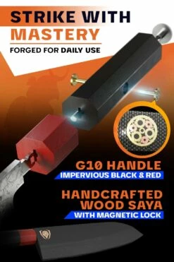 - Black and red G10 Garolite handle, highly impervious to heat and moisture. Perfect for busy kitchens.