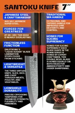 The Ronin Series 7” Santoku is a lightweight and versatile powerhouse. The santoku knife is named for its ‘three virtues’. Some say the three virtues are its ability to cut through meat, fish, and vegetables. Others believe it is the ability to chop, slice, and dice. Both are true. This knife is beloved by chefs for its functionality and ease of use.