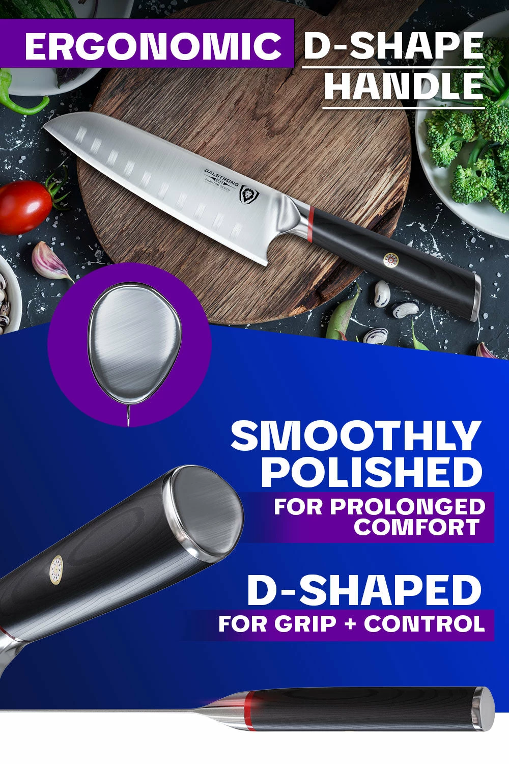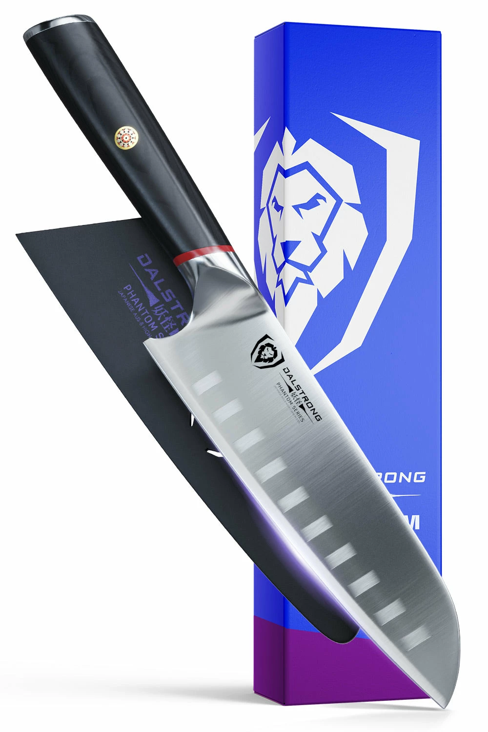 The Phantom Series 7” santoku further adds rock hollow divots which minimize stuck on food and create air pockets to reduce friction. Excelling at slicing, dicing and mincing (the ‘three virtues’ of the knife. ‘Santoku’ in Japanese means “three virtues’ of ‘three uses’), the Phantom Series santoku is a must for every chef’s cutlery roll. Featuring Japanese AUS-8 steel beautifully engraved with the Dalstrong name down the spine as well as the Japanese kanji for ‘phantom’ or ‘ghost’.