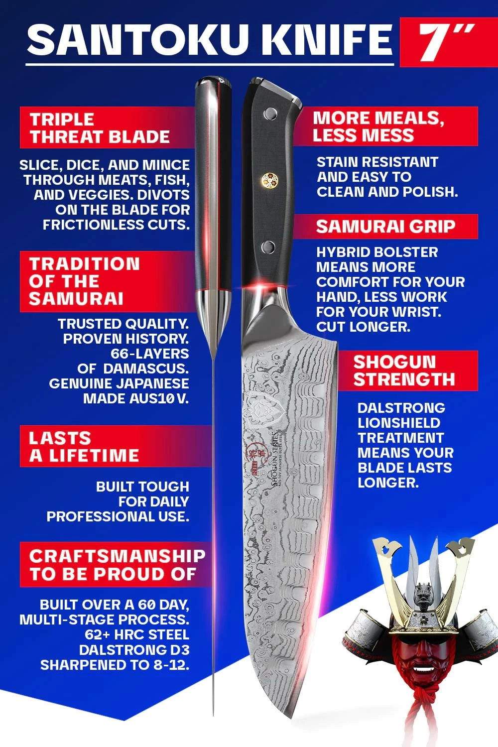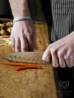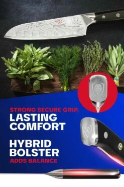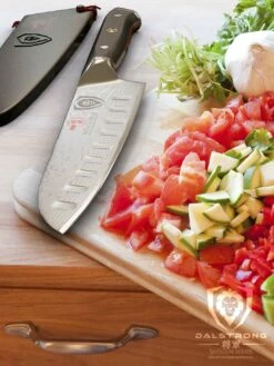 The Shogun Series 7” santoku knife is a ruthless kitchen warrior, ready at your command to unleash all manner of slicing, dicing and mincing mayhem. The Japanese word ‘santoku’, roughly translates to meaning ‘three virtues’, indicating the versatility of this style of knife and the type of cuts it excels at (slicing, dicing and mincing). The blade is typically shorter than a chef’s knife with noticeably different blade geometry. This includes a sheep’s foot rounded end and straighter edge, making this blade a push-cut master. The santoku knife is often claimed to be a fusion between a chef’s knife and a vegetable cleaver or nakiri, giving you the benefits of both. ‘Rock Hollow’ divots create tiny air pockets to aid in food release and minimize friction. Idea for produce, and boneless meats and fish. Hand-polishing reveals a magnificent visual pattern, Dalstrong’s ‘Tsunami Rose’. The super-steel core possesses extra high carbon levels, allowing for scalpel-like sharpness with exceptionally long lasting edge retention. Each knife is hand-finished in the Honbazuke 3-step method, creating a beautiful mirror polished edge at a staggeringly acute 8-10 degrees per side. The Shogun Series handle is meticulously constructed of G-10 Garolite, an incredibly strong military-grade inert and non-porous fiberglass-like material. It is highly impervious to both heat and moisture with life-long durability. The carefully engineered ergonomic handle is designed for superior hand control and comfort. while simultaneously being stabilized with an engraved end-cap for agile performance. To further enhance the beauty, an intricate copper mosaic pin adorns the center rivet. A premium quality polymer Dalstrong PerfectFit saya (sheath) with embossed Dalstrong logo and pin is included with the set to ensure your blade is carefully protected.