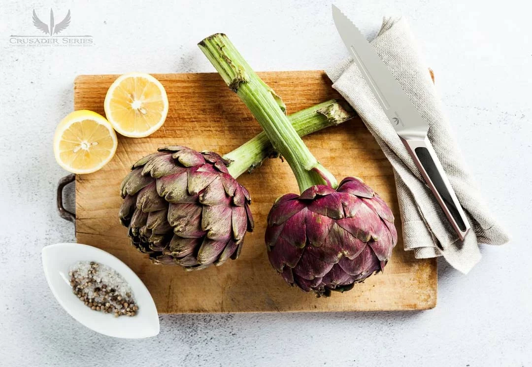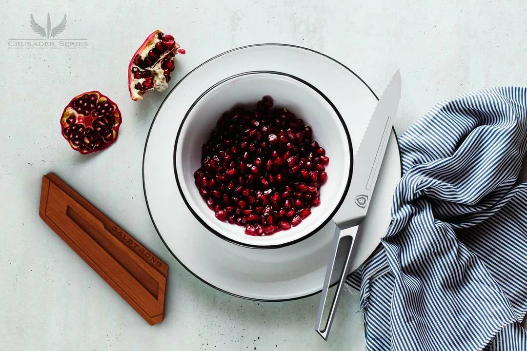 The Dalstrong Crusader Series is a new collection of stunningly designed, all-steel knives, offering a minimalist aesthetic with unobtrusive beauty. The less is more approach to this series’ design ensures a perfect pairing with any decor, while the razor sharp German made ThyssenKrupp x50crmov15 blade steel at 58+ Rockwell delivers exceptional performance. A seamless and hygienic transition from the blade to a high-chromium stainless steel handle characterizes the knives with an aggressive, forward moving stance. The sharply drawn lines forming the profile of each knife are indicative of modern design, while the ‘fuller’ groove machined into every blade is reminiscent of historical medieval swords, welding the past and present together. The stylized groove along the knife offers the added benefits of reducing friction and stuck on food, while also subtly lightening the knife and improving balance.