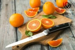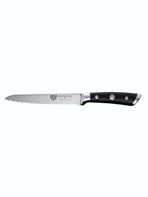 Designed for the tough day-to-day demands of the commercial kitchen, this versatile serrated utility knife is a master at slicing loaves, sausages, soft and hard fruits, and vegetables, and more. Create uniform slices without tearing and enjoy minimal crumb dispersion thanks to the carefully designed shape of the serrations. Engineered specifically to perform best with soft-textured foods or items with a hard exterior and soft interior, this is one tool every chef should carry with them. Featuring a beautiful, ergonomic, and ambidextrous black G10 Garolite handle, the Gladiator Series serrated utility knife is carefully designed for maximum comfort and maneuverability.