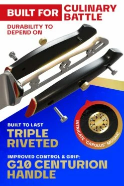 The hand-polished, satin-finish blade is paired with the ultra-durable and tactile G10 handle, ensuring that you’ll never lose your grip in the heat of culinary battle. Reinforced with a red G10 and Copper ring and adorned with a silver mosaic, this knife is built to last the rigors of every new flavor-packed campaign, with just the right amount of visual distinction. Stain resistant and easy to clean, the cleverly crafted blade is low maintenance but high performance, with an expertly engineered look and feel that will ensure victory whether at home or in professional settings.