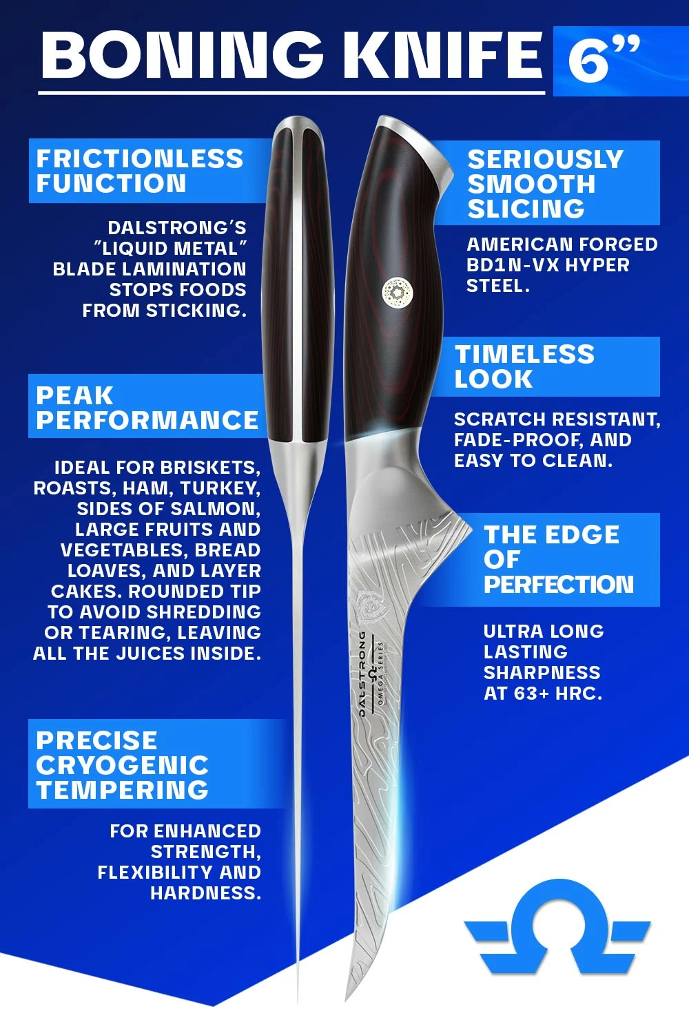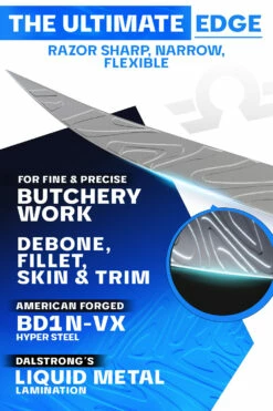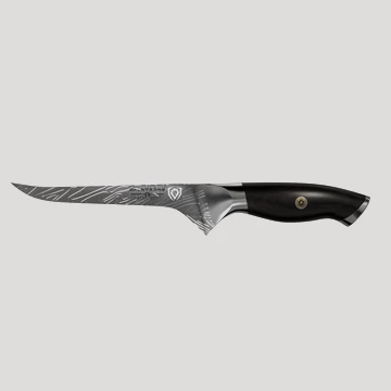 The Omega Series boning and fillet knife is the essential de-boning tool for any professional chef or butcher. Masterfully engineered for fine & precise butchery work, this knife excels at de-boning, filleting, skinning, trimming and butterflying. The narrow blade is shaped to effortlessly sail along the contours of bones, slicing flesh away with ease. The “LiquidMetal” pattern on the blade reduces drag and increases efficiency, allowing you to glide through sinew, fat and muscle and provide perfectly clean separation. Featuring ultra-premium American forged BD1N-VX hyper steel. The blade’s composition and added vacuum heat-treatment to 63HRC provide astonishing performance, with a screamingly sharp edge. Painstakingly finished to 8-12° per side by expert blade smiths using the traditional 3-step Honbazuke method. The addition of Nitrogen increases hardness, flexibility, and toughness, while providing exceptional wear resistance, ensuring your blade’s performance will last even-longer and take you further. Gorgeously laminated and hot-forged, the ‘LiquidMetal’ pattern on the blade minimizes drag and stuck on food while maximizing your slicing efficiency, allowing you to glide through prep. The G10 woven fibreglass handle is near impervious to heat, cold and moisture and is presented in a midnight black with subtle dark red colorings. Centered in the full-tang handle is an ornate and over-sized copper and brass mosaic, creating a distinct and striking appearance. The painstakingly detailed craftsmanship continues with the Dalstrong lionhead insignia carefully engraved on both the mirror-polished end-cap and blade itself.