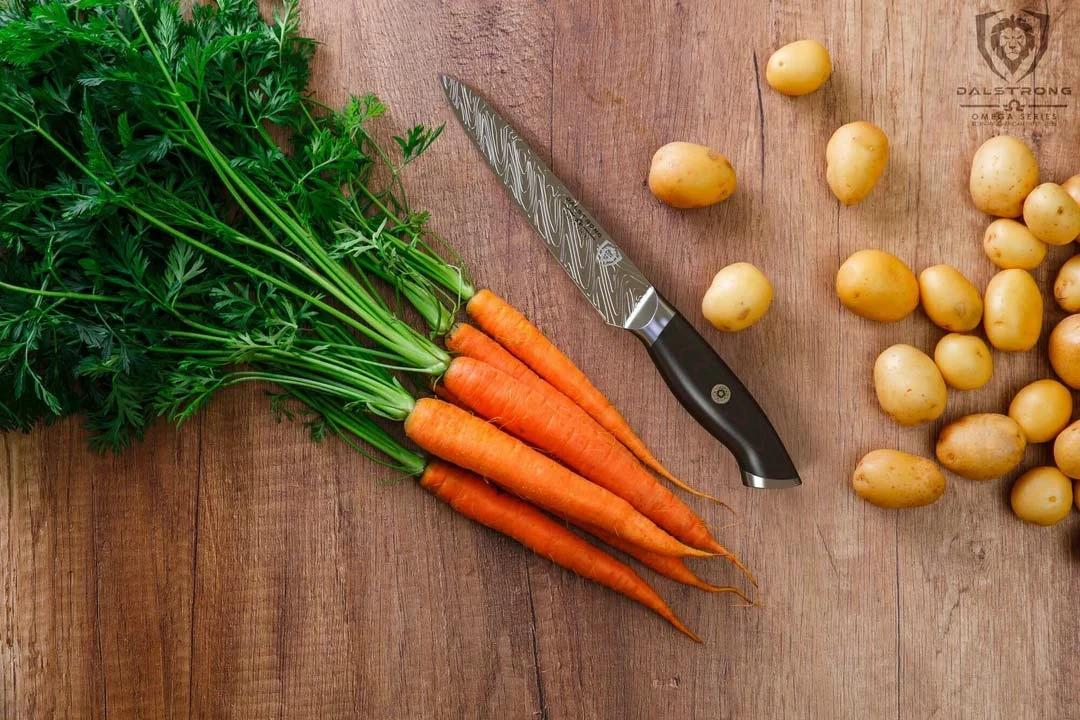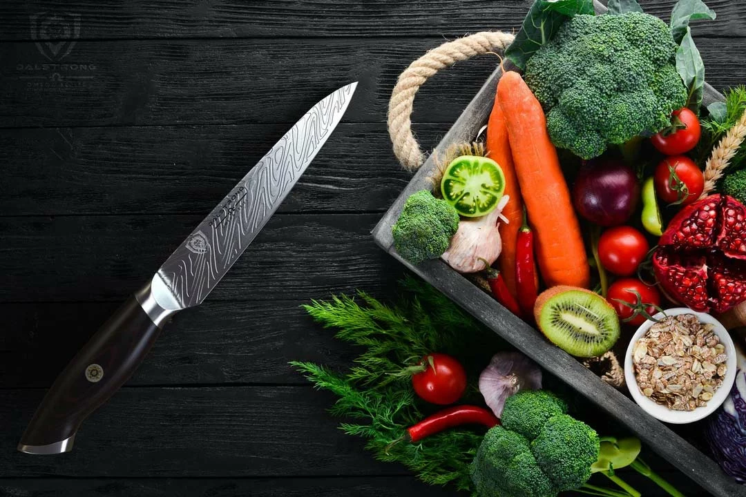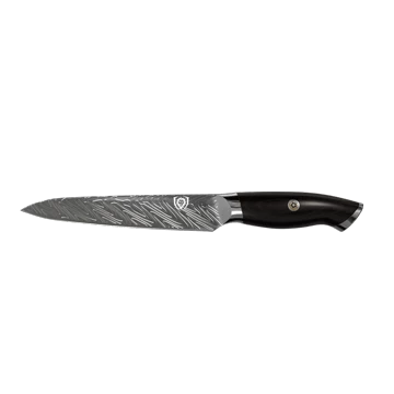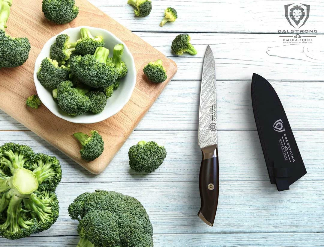 The Omega Series 5.5” Utility Knife is a master of versatility and precision cuts that excels at a variety of culinary work from slicing, trimming, and sectioning, to coring, and peeling a large assortment of smaller fruits and vegetables. This knife is an essential day-to-day tool that is designed to tackle a multitude of culinary challenges from trimming broccoli and green beans, to chopping herbs and spices with moderate rock chops stemming from the blade’s slight belly. The “LiquidMetal” pattern on the blade reduces drag and increases efficiency, allowing you to glide through prep. Featuring ultra-premium American forged BD1N-VX hyper steel, the addition of Nitrogen increases hardness, flexibility, and toughness, while the blade’s composition and added vacuum heat-treatment to 63HRC provide astonishing performance, with a screamingly sharp edge. Painstakingly finished to 8-12° per side by expert blade smiths using the traditional 3-step Honbazuke method. The G10 woven fibreglass handle is near impervious to heat, cold and moisture and is presented in a midnight black with subtle dark red colorings. Centered in the full-tang handle is an ornate and over-sized copper and brass mosaic, creating a distinct and striking appearance. The painstakingly detailed craftsmanship continues with the Dalstrong lionhead insignia carefully engraved on both the mirror-polished end-cap and blade itself. A black PU leather sheath with button clip and distinctive red-stitching is also included to ensure the blade’s stylish protection and your own safety. Featuring all the precision, premium materials and workmanship you would expect from Dalstrong, only dialled up.