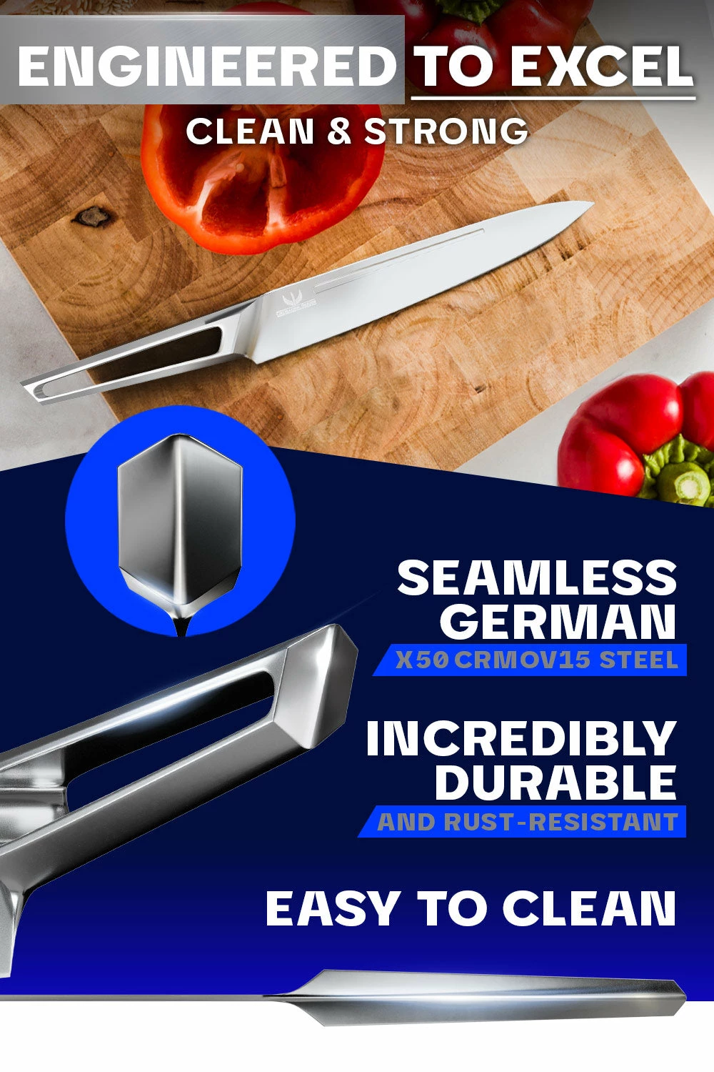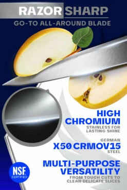 - Blade seamlessly transitions into a high-chromium stainless steel handle