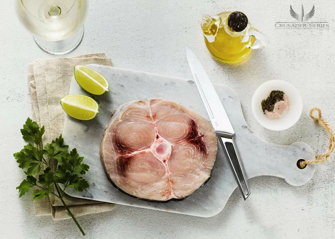 The Dalstrong Crusader Series is a new collection of stunningly designed, all-steel knives, offering a minimalist aesthetic with unobtrusive beauty. The less is more approach to this series’ design ensures a perfect pairing with any decor, while the razor sharp German made ThyssenKrupp x50crmov15 blade steel at 58+ Rockwell delivers exceptional performance. A seamless and hygienic transition from the blade to a high-chromium stainless steel handle characterizes the knives with an aggressive, forward moving stance. The sharply drawn lines forming the profile of each knife are indicative of modern design, while the ‘fuller’ groove machined into every blade is reminiscent of historical medieval swords, welding the past and present together. The stylized groove along the knife offers the added benefits of reducing friction and stuck on food, while also subtly lightening the knife and improving balance.