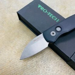 Protech Runt 5 R5105 Textured Black Handle 1.9″ Stonewash 20CV Wharncliffe Blade Auto Knife